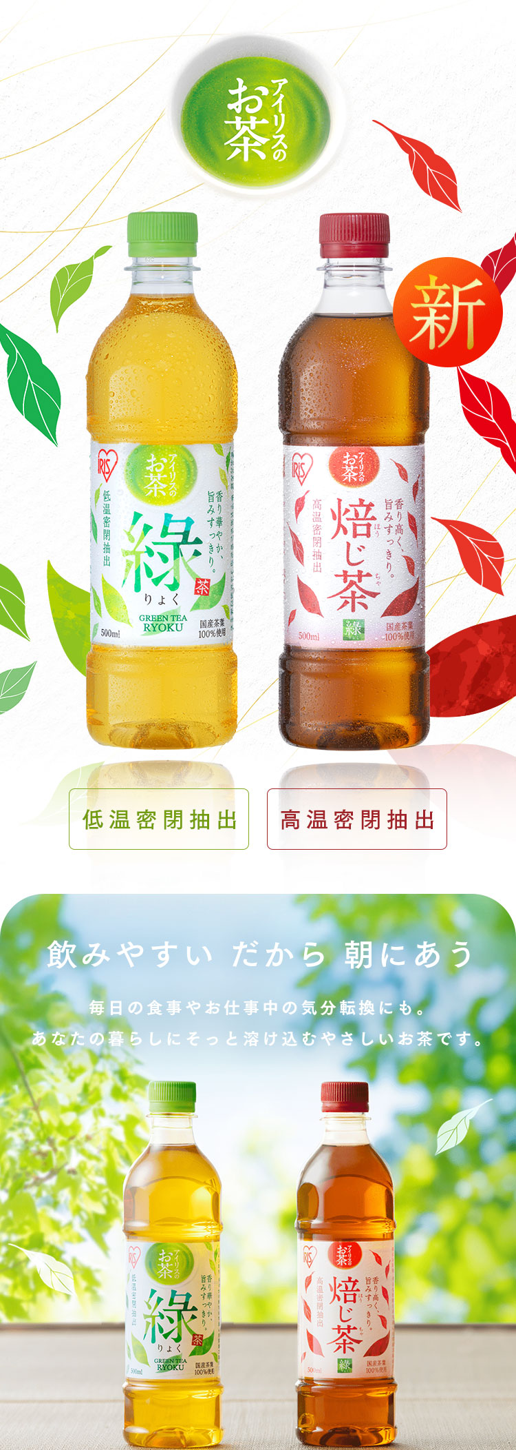 【新発売】お茶 緑茶 ほうじ茶 ペットボトル 500ml 24本 選べる ラベルレス 密閉抽出 香り高い 旨みすっきり 緑 焙じ茶 アイリスオーヤマ アイリスフーズ*