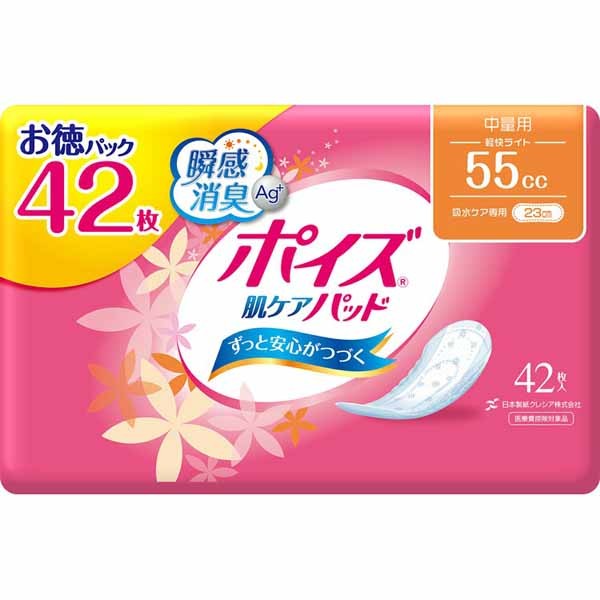 吸水ナプキン ポイズ 肌ケアパッド 中量用(軽快ライト)55cc お徳42枚 (女性の軽い尿もれ用) 日本製紙クレシア 新生活 (D)