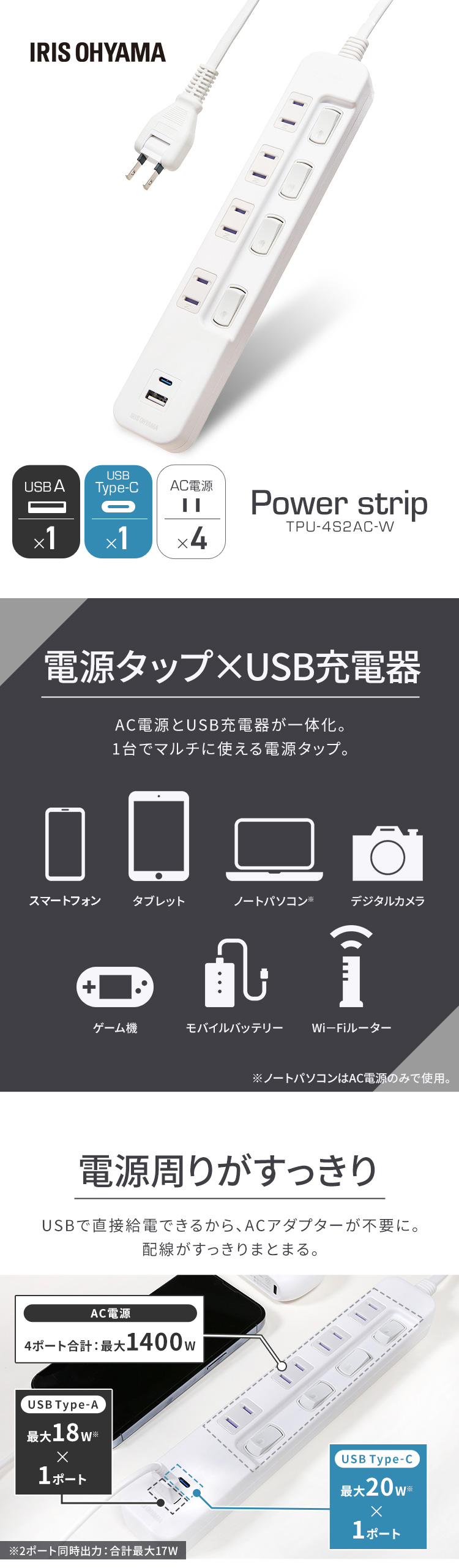 延長コード 電源タップ コンセント USB充電ポート付きタップ コンセントタップ アイリスオーヤマ TPU-4S2AC-W (D)