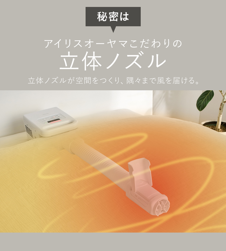 冷えたふとんを一気にあたため、ふんわり仕上げる。