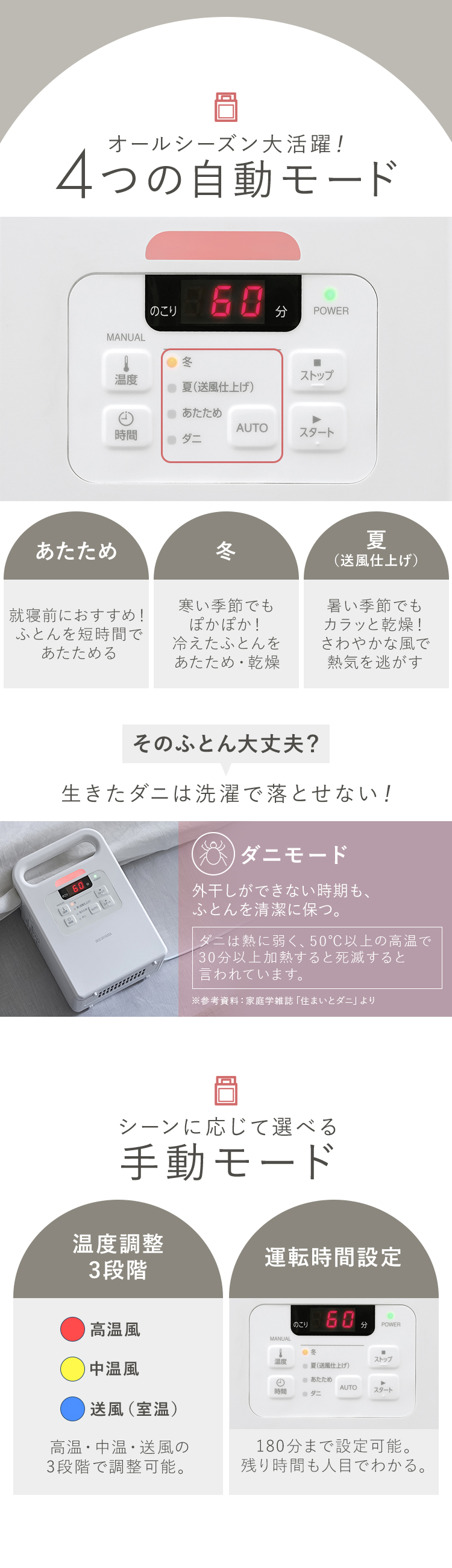・ダニモード:外干しができない時期もふとんを清潔に保つ。[ダニは熱に弱く、50℃以上の高温で30分以上加熱すると死滅すると言われています。※参考資料:家庭学雑誌「住まいとダニ」より。]