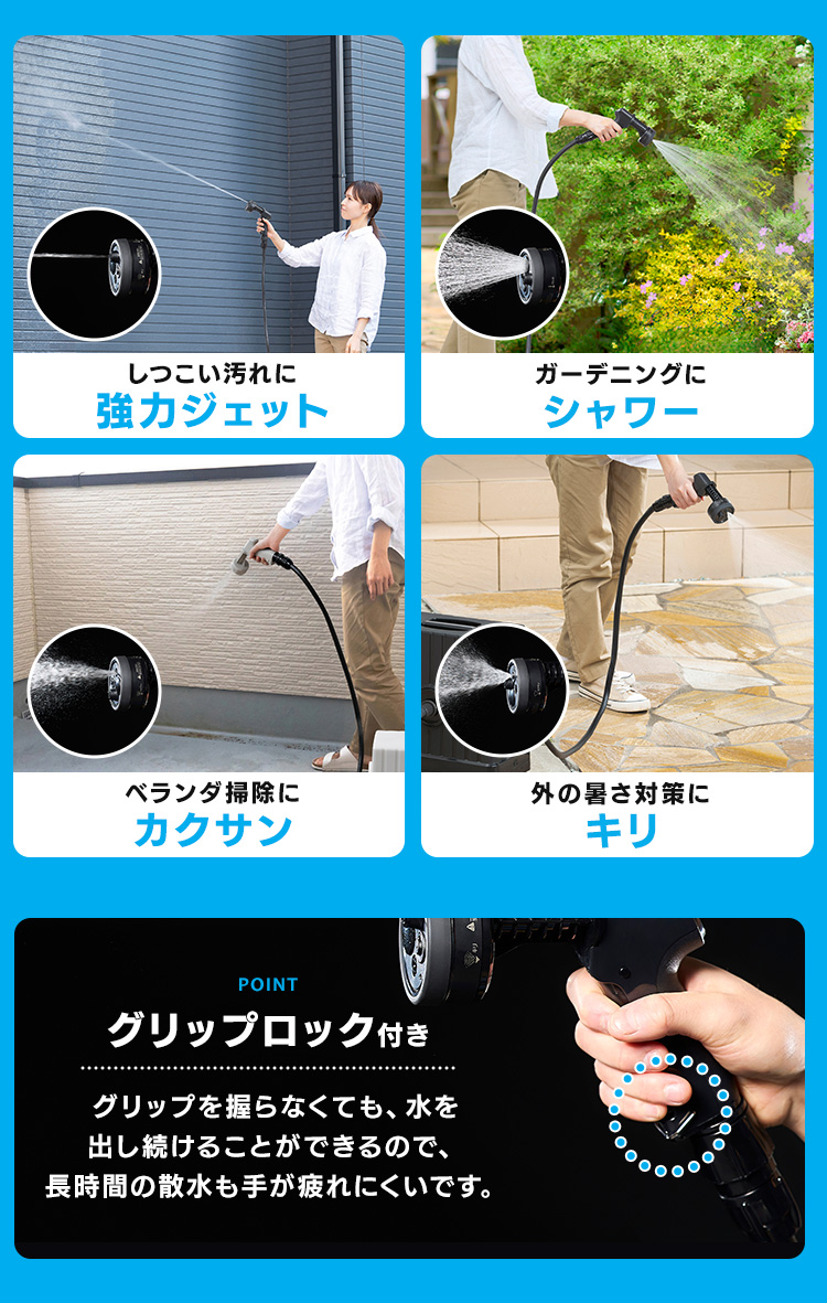 用途によって使い分けできる、4つの噴射パターン(キリ、カクサン、シャワー、ジェット)があります。