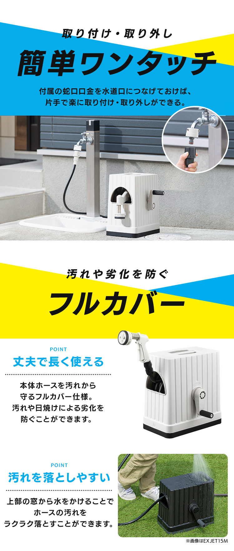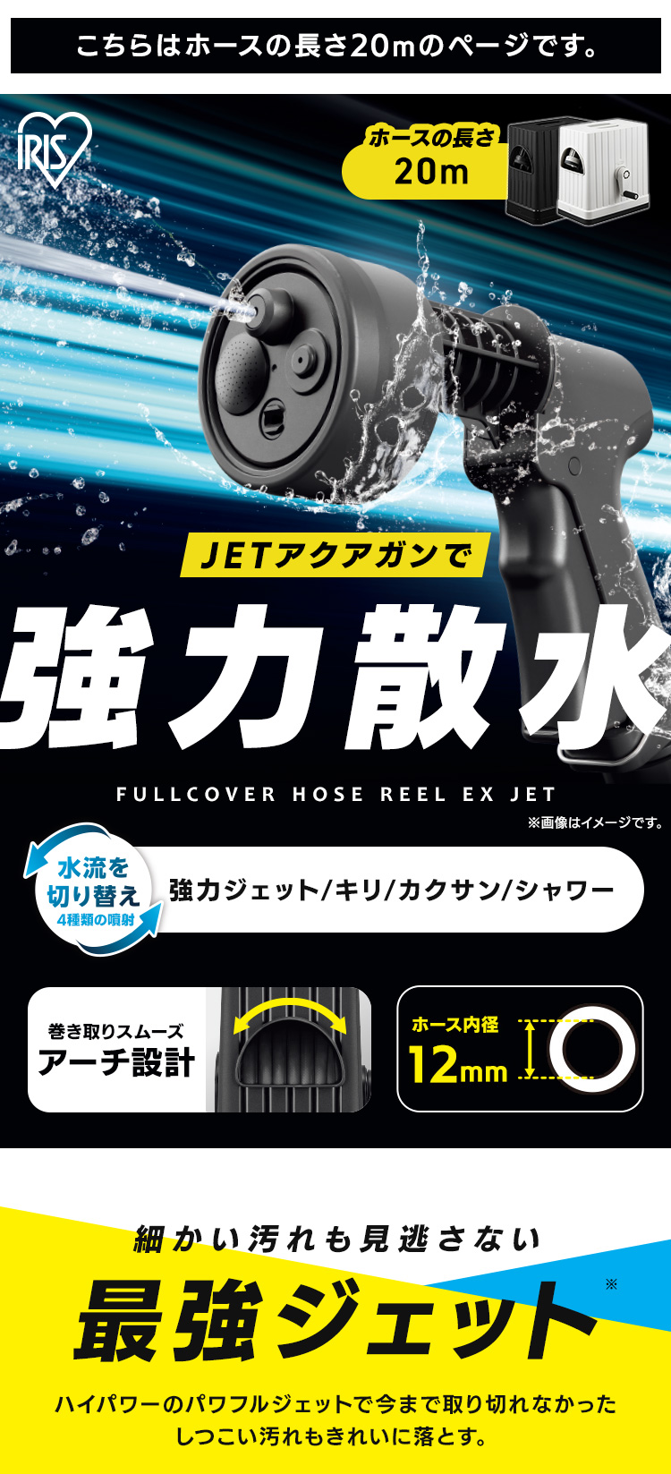 頑固な汚れも当社史上強力ジェット※1で瞬時に除去できる、フルカバーホースリールです(ジェットパワー約20%UP※2)。