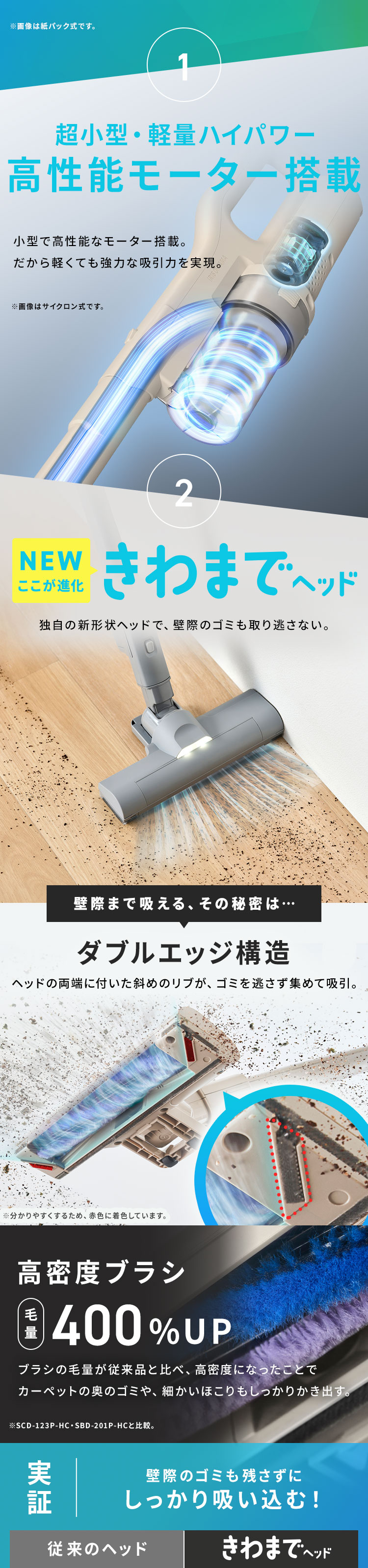 アイリスオーヤマ独自の新形状[きわまでヘッド]で、よりゴミを吸い逃しにくい構造です。