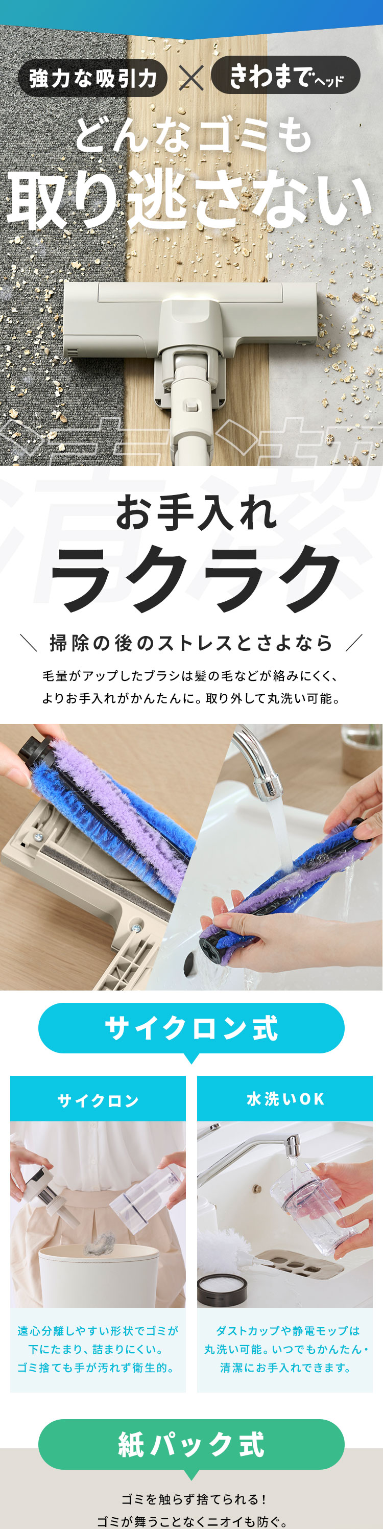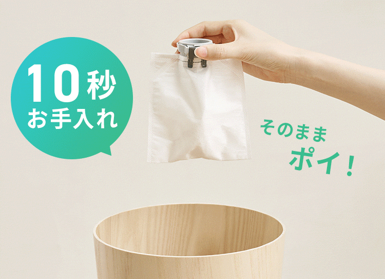 取り出したらそのままゴミ箱へ捨てられる紙パック式なので、ゴミも舞いにくくニオイも防げます。