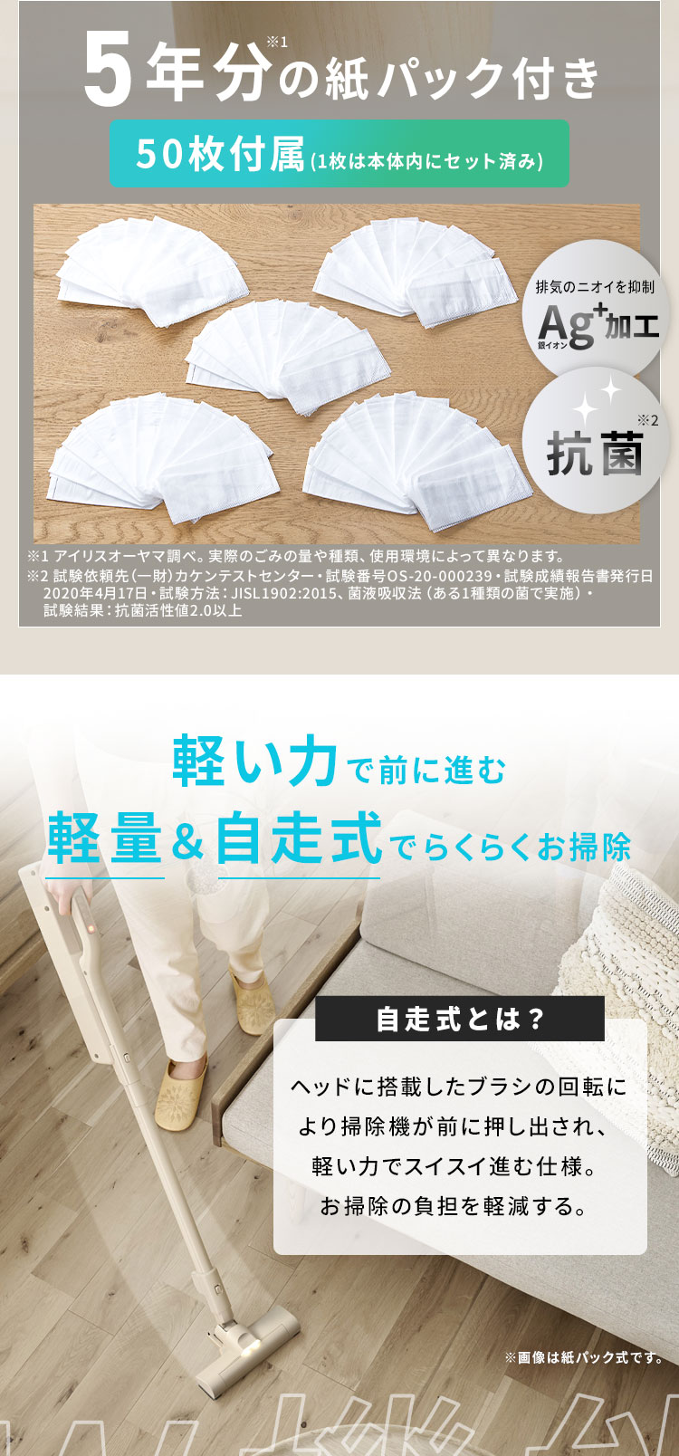 専用の紙パックは抗菌・防臭効果のあるAg+(銀イオン)加工を施した不織布製です。