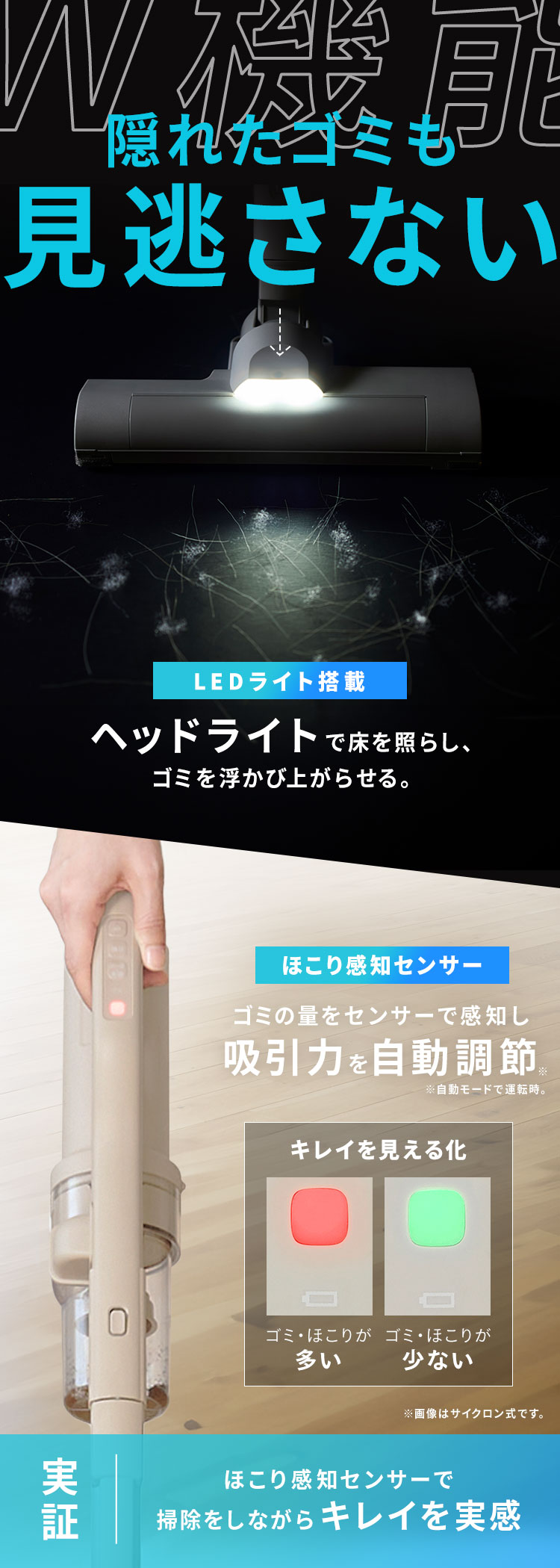 隠れたゴミを見逃さない[W機能:LED/ホコリ感知センサー]を搭載しています。