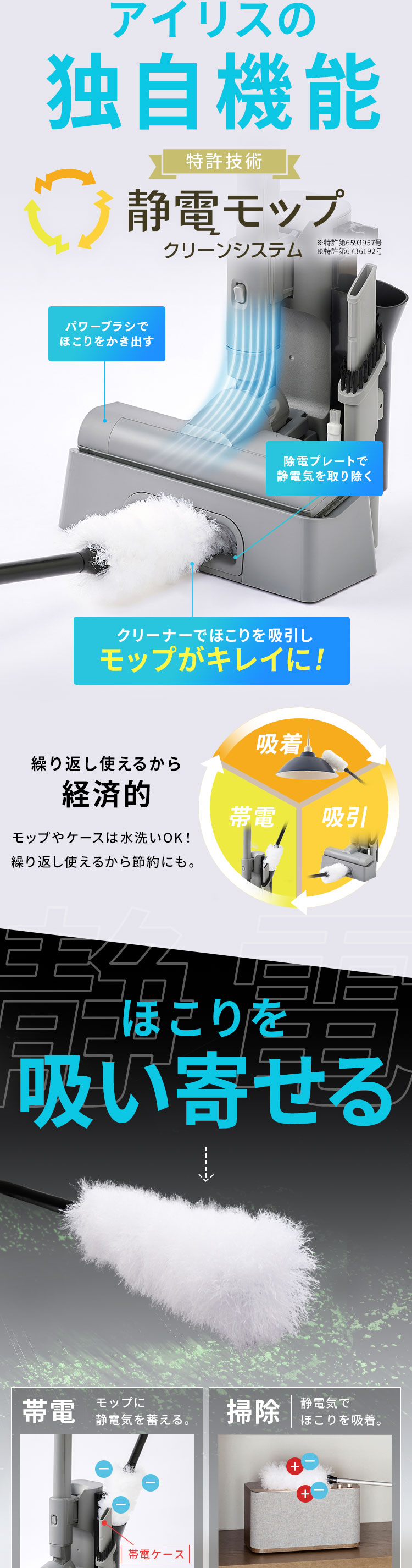 アイリスオーヤマ独自技術[静電モップクリーンシステム]を搭載しています。