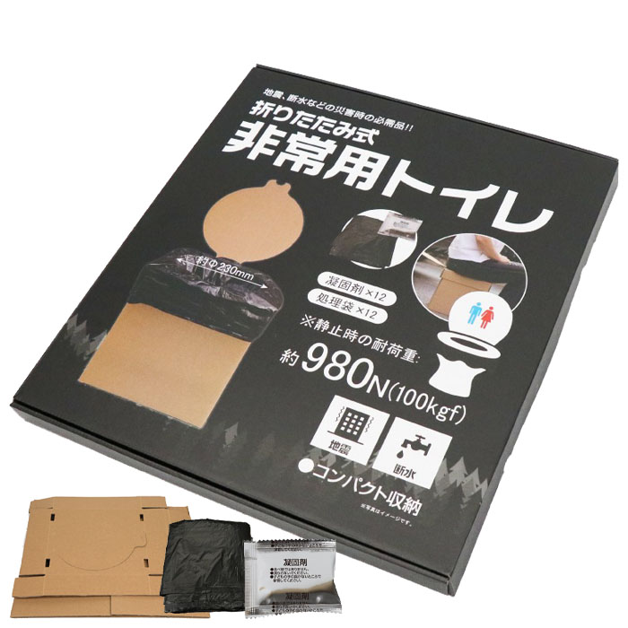| 地震、断水などの災害時の必需品。 トイレが無くてもトイレが出来る! どこでも簡易トイレの出来上がり! 【注意事項】 ●平らな場所に設置し、ゆっくりと着座してください。 ●処理袋は1回の使用で交換してください。 ●凝固剤は処理袋に入れてください。トイレ本体の中には直接投入しないでください。 ●お子様やペットなどが製品で遊んだりすることの無いように手の届かない所に保管してください。 ●本製品は紙製品です。下記に注意し、高温・直射日光のあたる所、また湿気の多い所を避けて保管してください。 ●本来の用途以外でのご使用はお止めください。 ●使用後は各自治体の廃棄指示に従って処理してください。 ●使用する際は、化学反応が起こることもある為、ほかの薬剤と混ぜずに使用してください。 ●凝固剤は水に流すことができません。 ●尿が多く出た場合は凝固しにくくなることがあります。 ●品質には万全を期しておりますが、本体・便座の組立時や使用後の破損などトラブルが発生した場合、弊社では対応いたしかねます。 ●凝固剤は、便にも使用できますが、水分を固めるものであり、完全に便を固めることはできません。 ●薬の副作用や疾病などの影響により、尿や便が凝固しないことがあります。凝固しない場合でも水洗トイレに流さないでください。 |