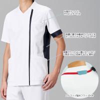 ■機能・特長:制菌加工 静電気帯電防止 ストレッチ 透け防止効果 吸水加工 速乾性 接触冷感性 工業洗濯可 後ろ襟下にストラップ留めフラップ付き 左胸ポケットにPHSホルダー付き 両腰にキーループ付き 両腰に二重ポケット付き