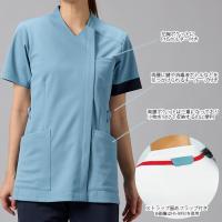 ■機能・特長:制菌加工 静電気帯電防止 ストレッチ 透け防止効果 吸水加工 速乾性 接触冷感性 工業洗濯可 後ろ襟下にストラップ留めフラップ付き 左胸ポケットにPHSホルダー付き 両腰にキーループ付き 両腰に二重ポケット付き