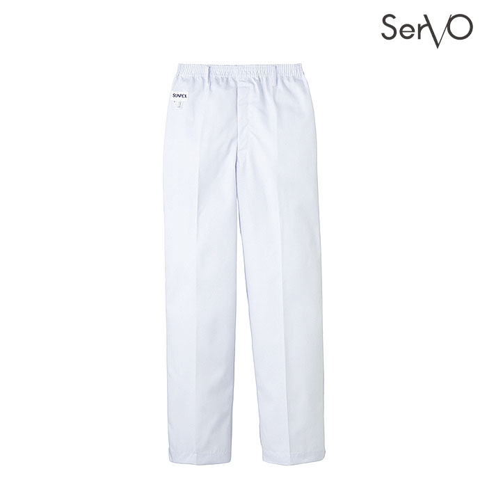 | 給食サービスにおすすめのストレートパンツ。 ウエスト総ゴム、前開き金属ファスナー、右後外ポケット付き。 |