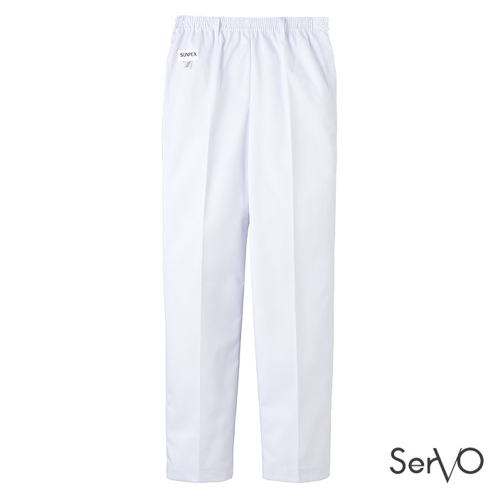 | 給食サービスにおすすめのストレートパンツ。 ウエスト総ゴム、左脇開き金属ファスナー、右後外ポケット付き。 |
