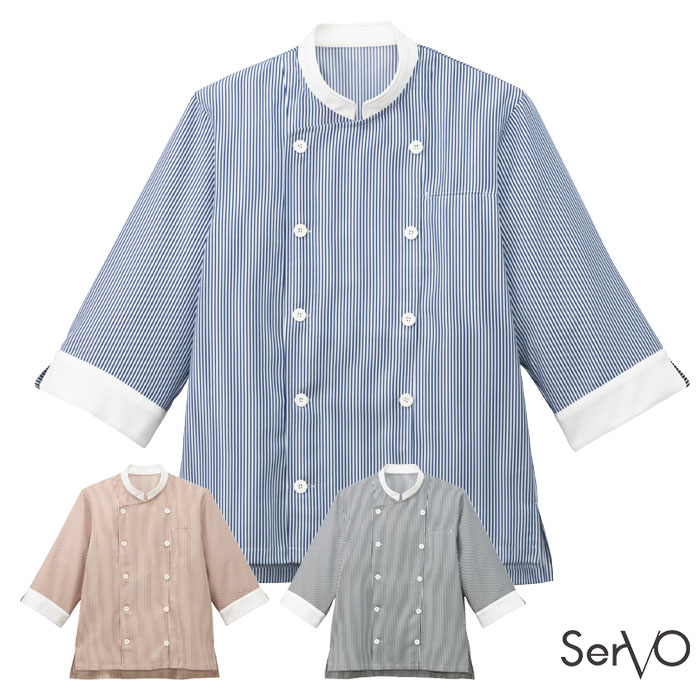 | 動きやすい七分袖とストライプで爽やか&クリーンなイメージ。防脱色加工と体毛落下防止ネット付きでハサップを支援します。スーパーやデパ地下などの店頭販売をはじめ、接客のシーンで活躍します。 |