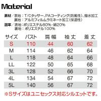 | 表地:T/Cタッサー、PAコーティング(防風性)、撥水加工裏地:アルミフィルムラミネート加工(保温性)[混率]表地:ポリエステル80%・綿20%裏地:ポリエステル100% |