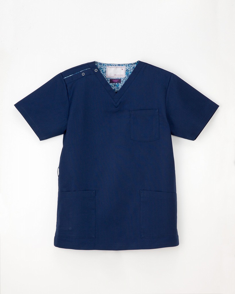 ストレッチ性があり、色落ちしにくい機能素材を使用したスクラブです。開き部分と、背裏にリバティプリント生地を使用しました。暖色系・寒色系とベースカラーによってリバティプリント柄を変えています。さりげない部分使いが着用する方のモチベーションを高めてくれます。背中部分の紋章織ネームもデザインポイントになっています。