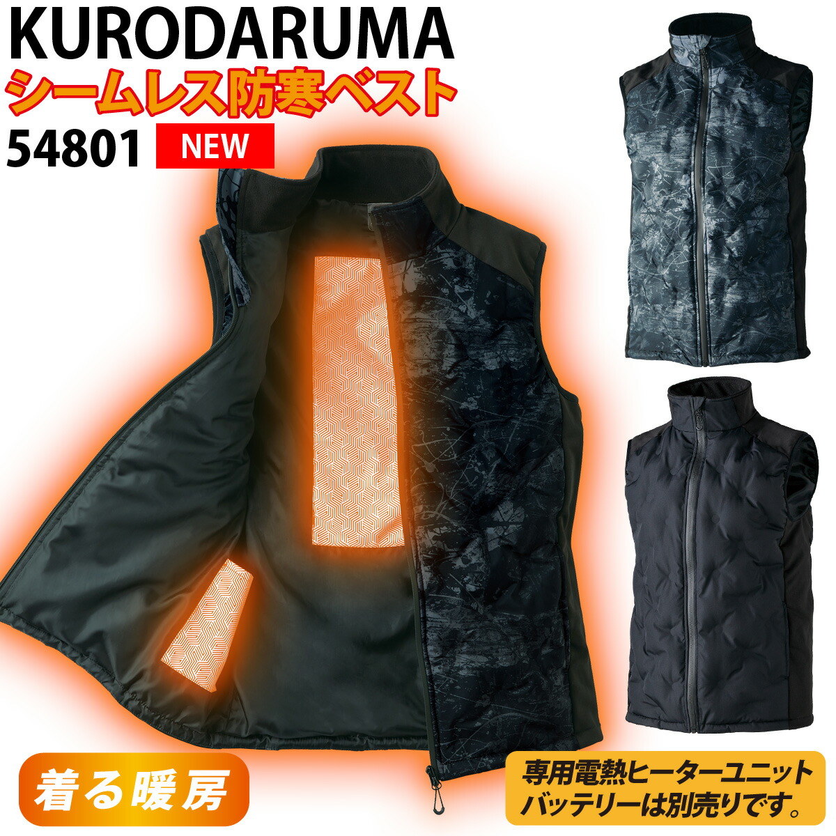 クロダルマ シームレス防寒ベスト 54801 軽量 保温 スリムフィット 簡単脱着 反射プリント 作業服 作業着 秋冬 かっこいい メンズ ヒーター収納ポケット