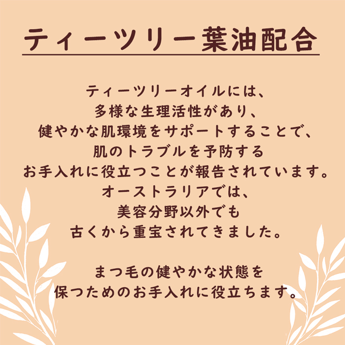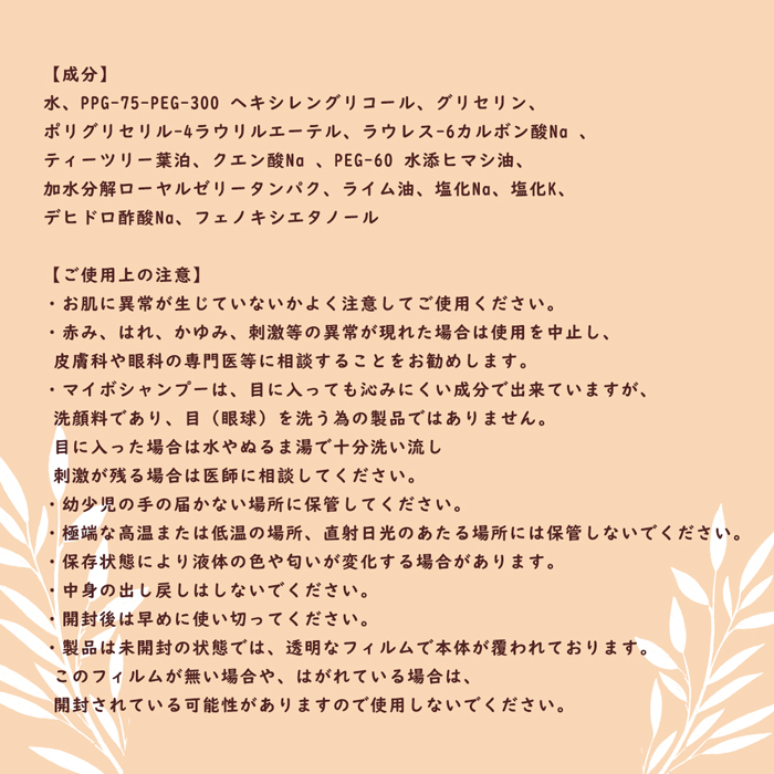 | マイボシャンプー Tea Tree 1.0 にはティーツリー葉油が1%以上配合されています。 ティーツリーオイルには多様な生理活性があり、健やかな肌環境をサポートすることで、肌のトラブルを予防するお手入れに役立つことが報告されています。オーストラリアでは、美容分野以外でも古くから重宝されてきました。 | マイボシャンプーは、目の周辺に使われる事を考慮し汚れや脂を落としつつ肌が必要以上に乾燥したりつっぱりを減らす様に成分を配合しています。 |