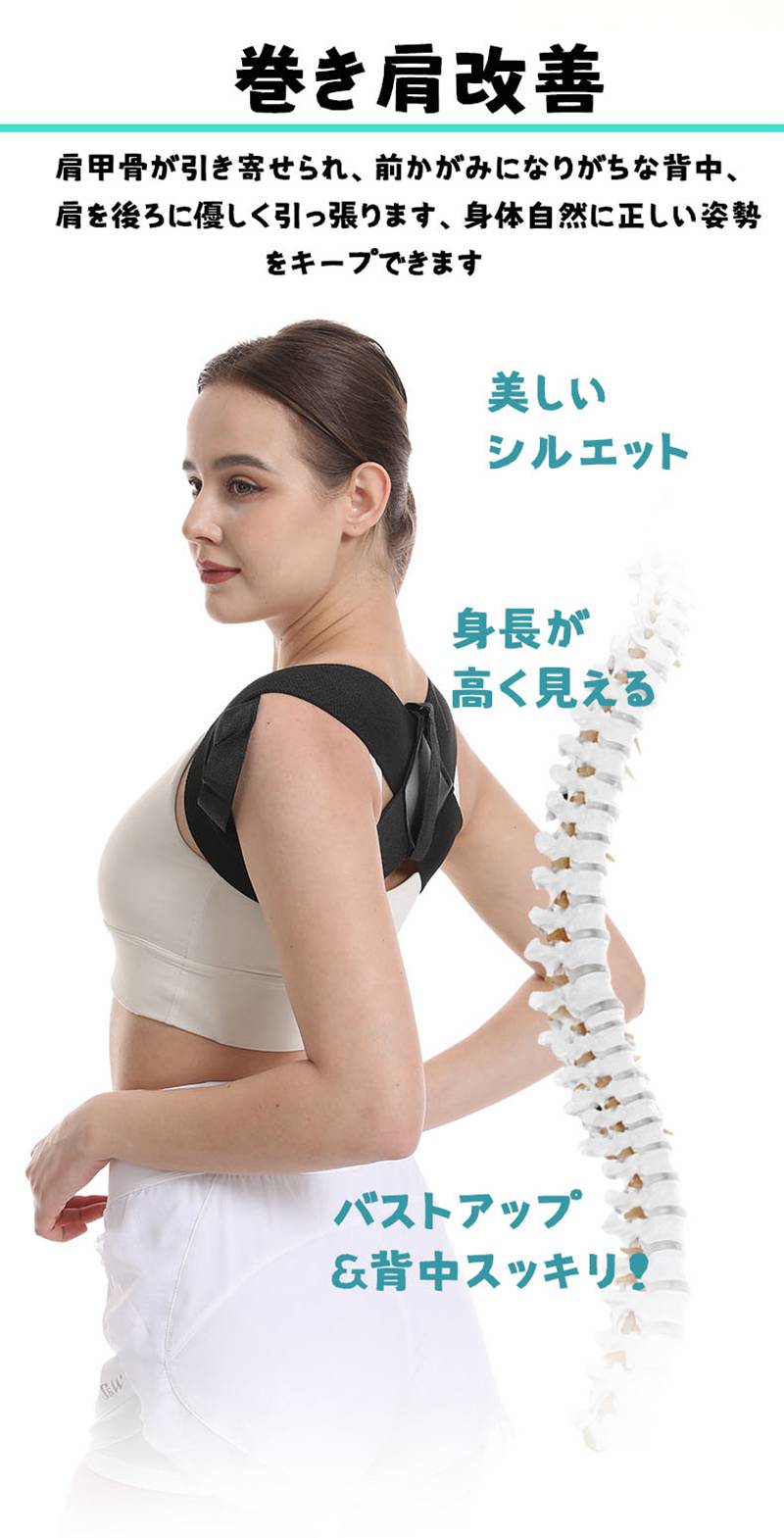 背中をまっすぐにキープして、巻き肩や猫背を改善!肩や背中の負担を軽減します。毎日使いたくなる姿勢矯正ベルトです。