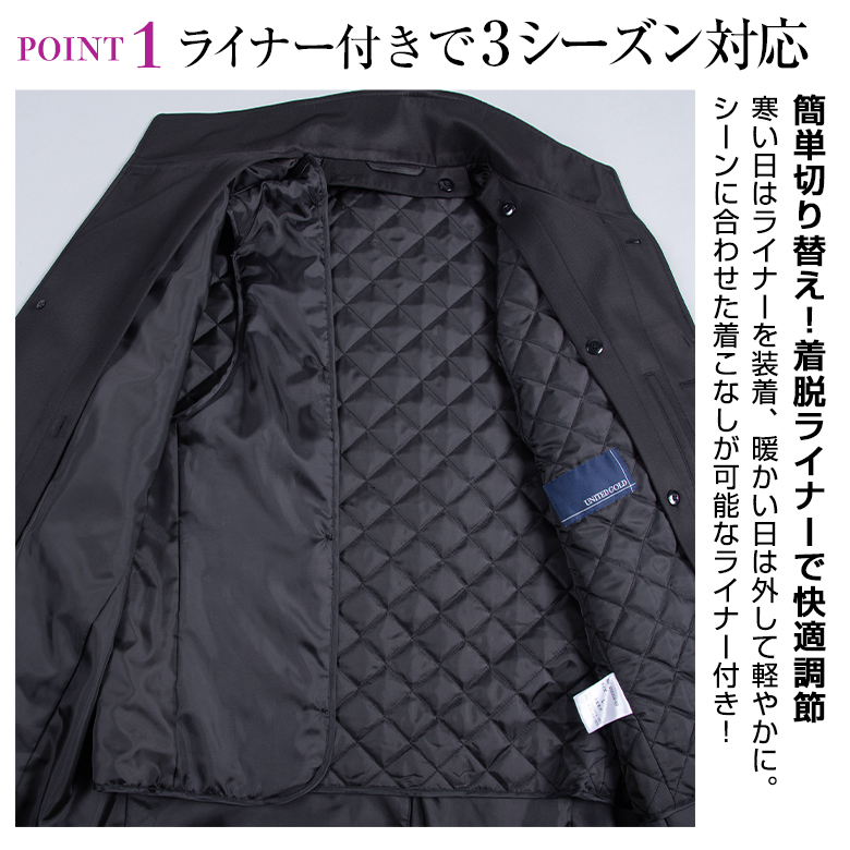 【仕様】総裏仕様 フロント4つボタン センターベント 袖口カフストラップ付き 左右ポケット 左胸内ポケット 中綿ライナー付き