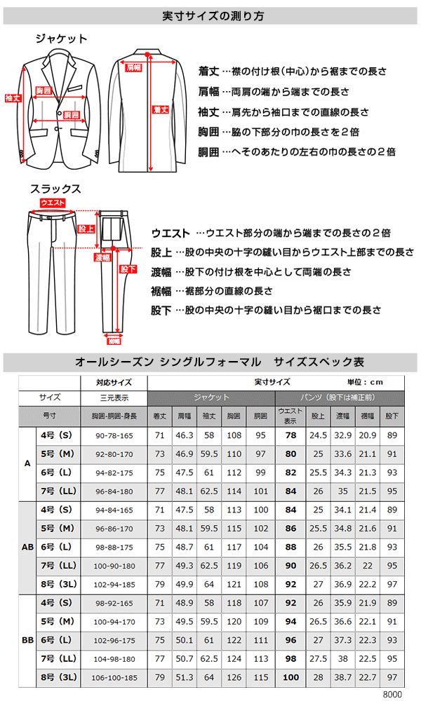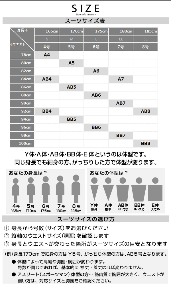 AB体4号(S) AB体5号(M) AB体6号(L) AB体7号(LL) AB体8号(3L)