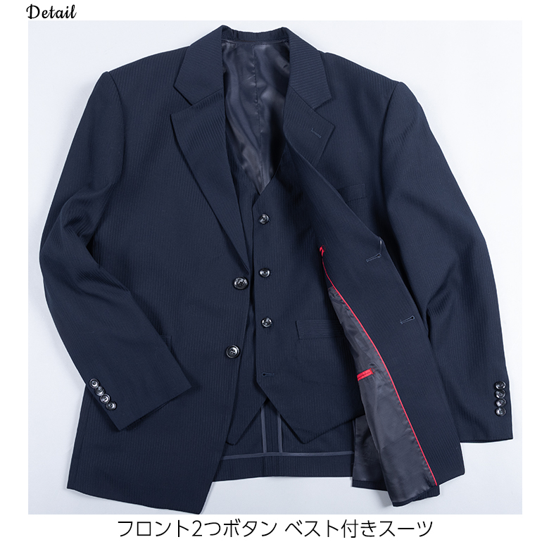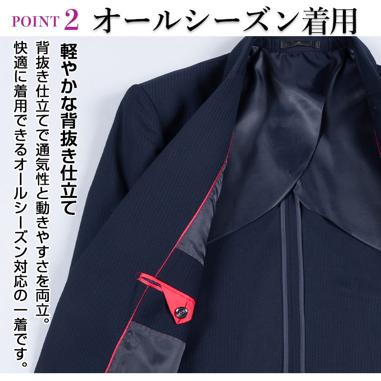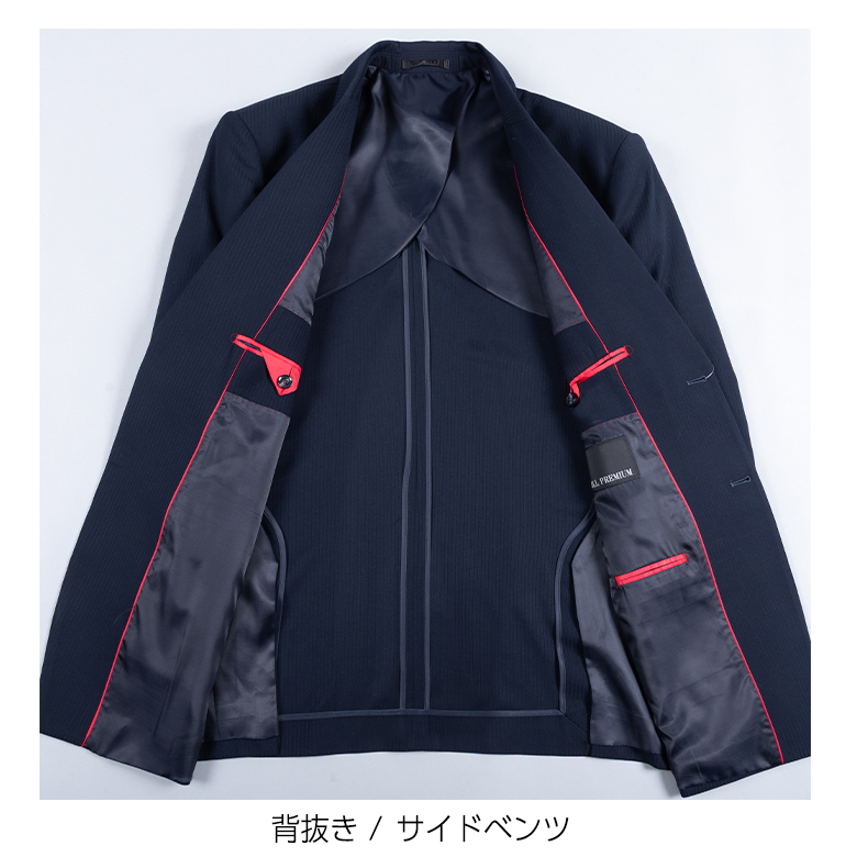 フロント2つボタン 背抜き仕様 サイドベンツ ソデ4つボタン 左右ポケット 左胸ポケット 左右胸内ポケット 脇汗パット ベストフロント4つボタン