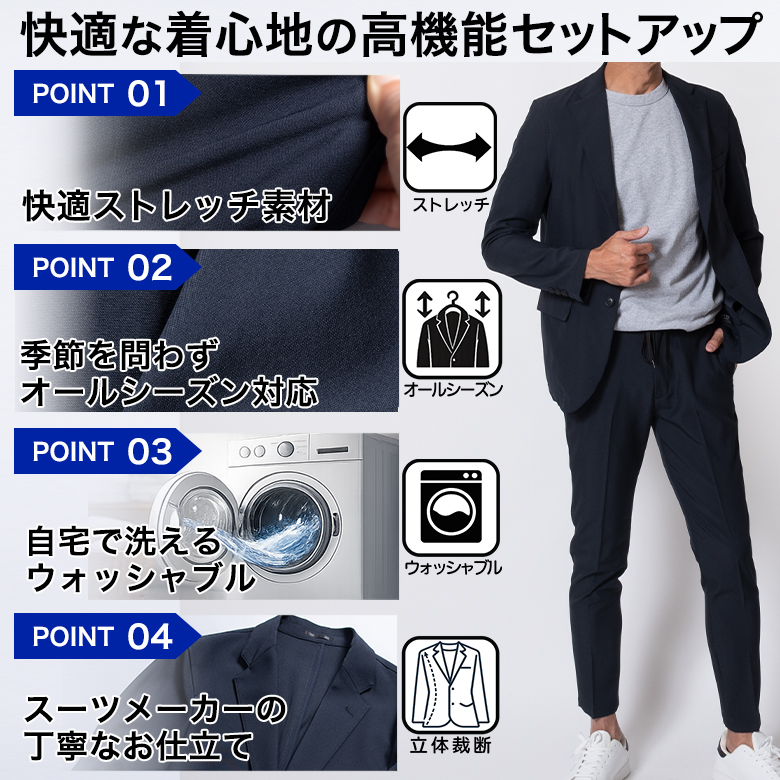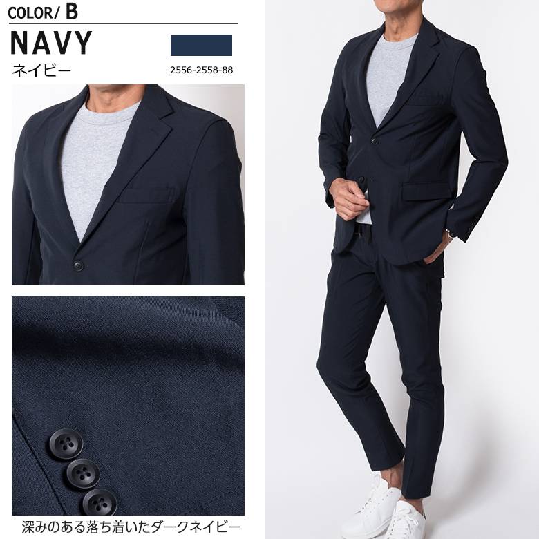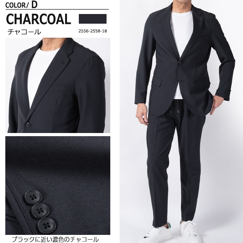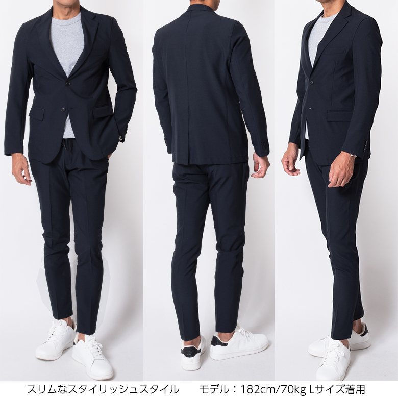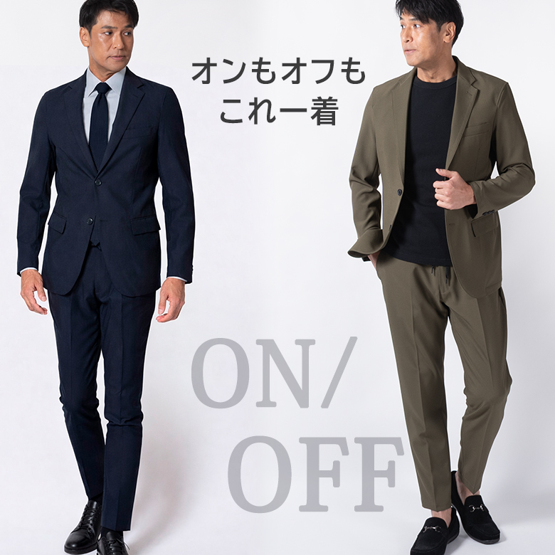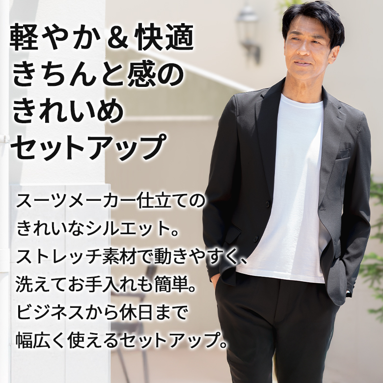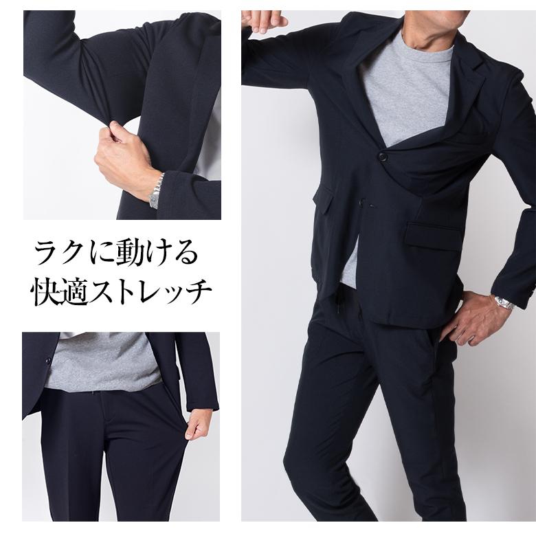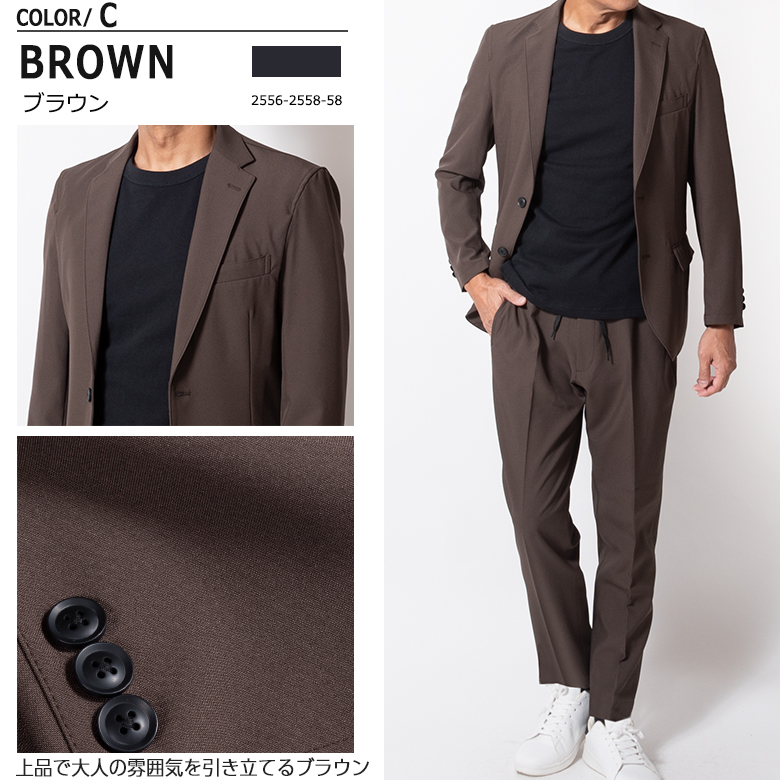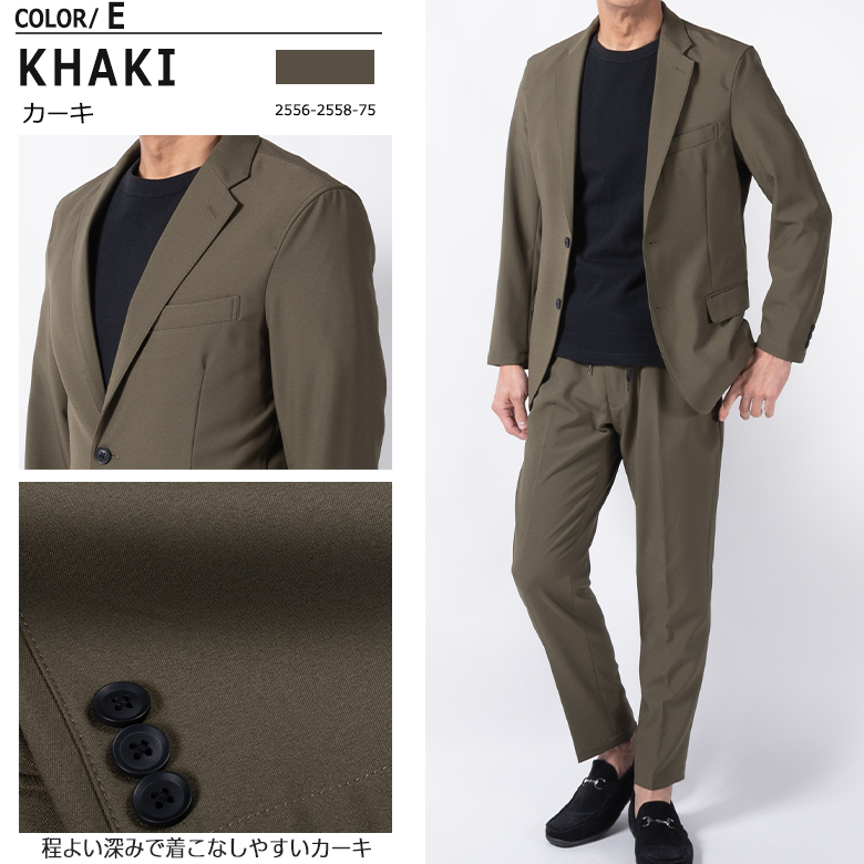 【キーワード】 カジュアルスーツ スリムスーツ セットアップスーツ テレワーク 大きいサイズ 小さいサイズ ビッグサイズ リモートワーク 在宅ワーク 在宅勤務 出張 旅行 トラベル オフィス ビジネス ビジカジ ゴルフ 休日 スリム テーパードパンツ シャーリング ストレッチ ネイビー 濃紺 ブラック 黒 ネイビー ブラウン 茶 カーキ チャコールグレー チャコール 秋冬 春夏