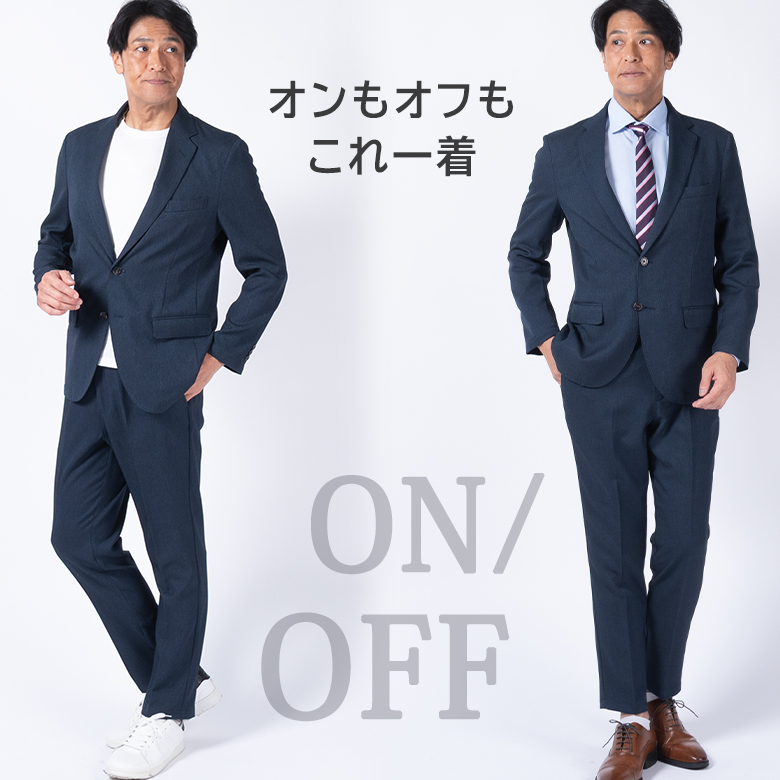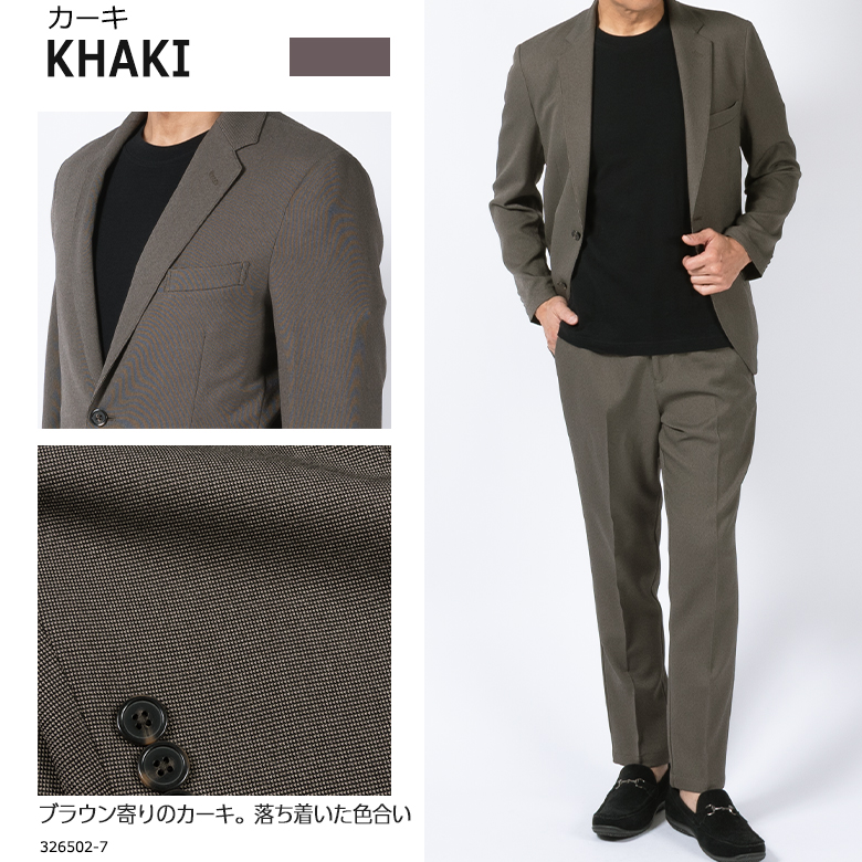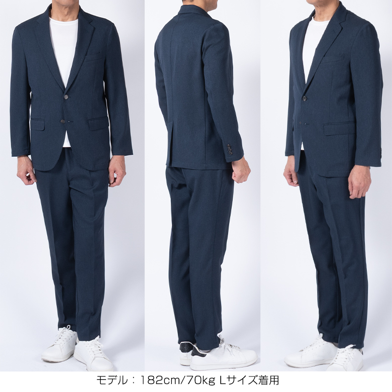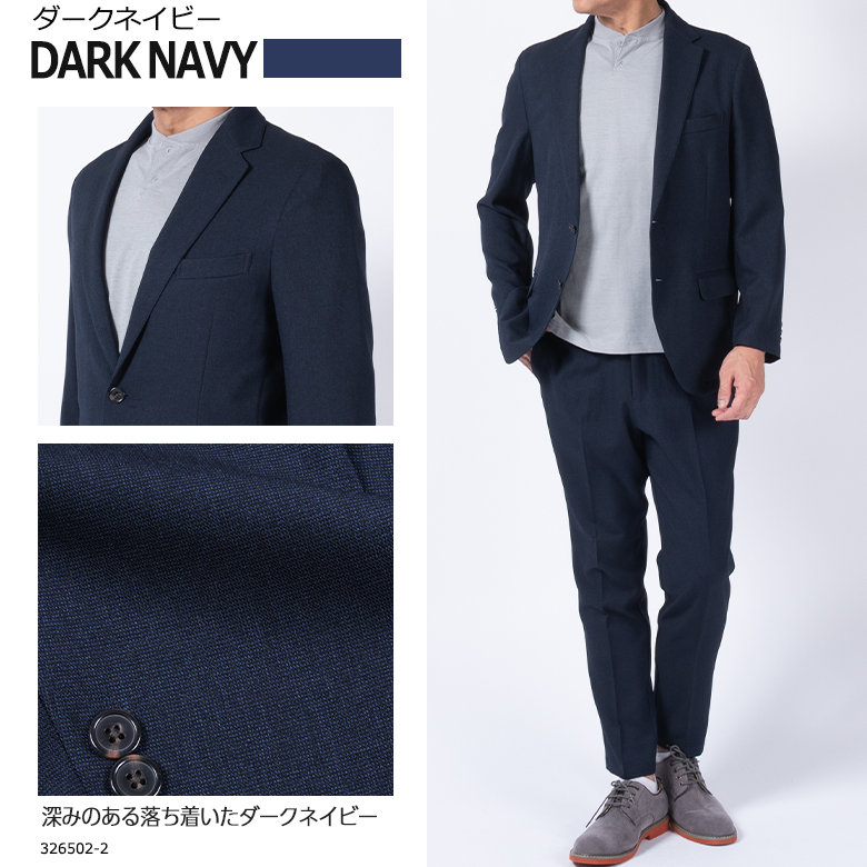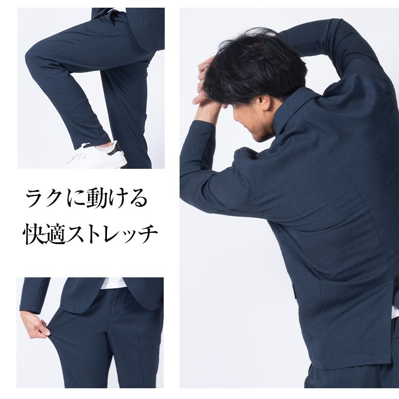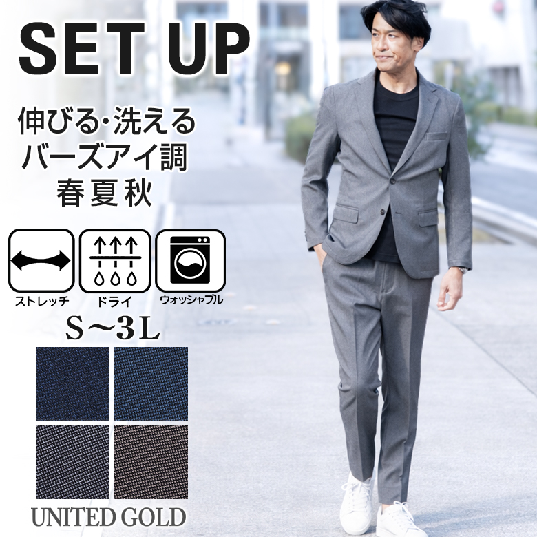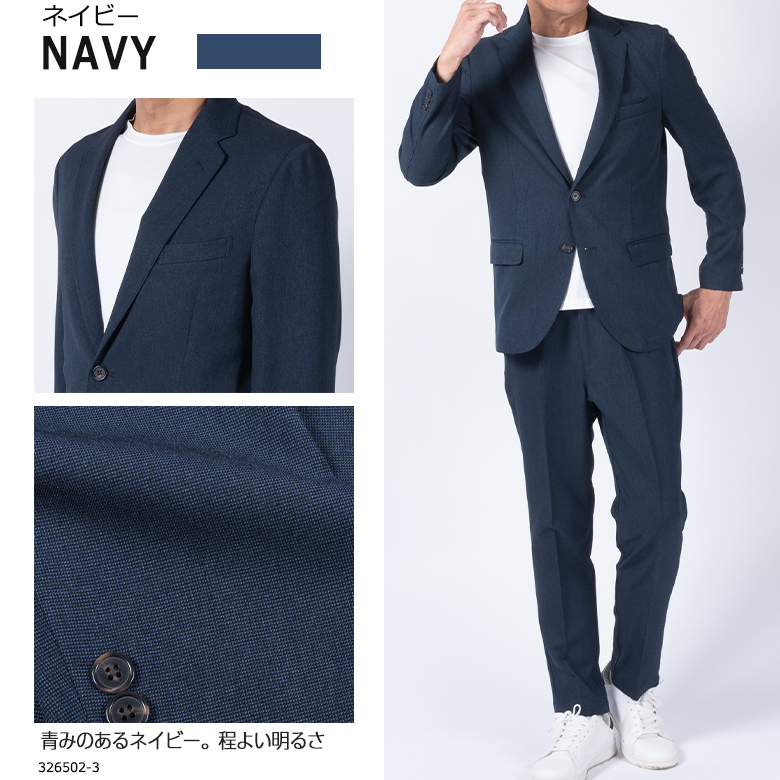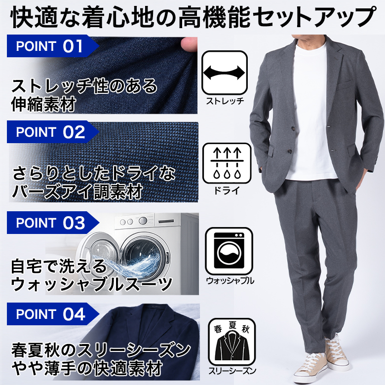 【キーワード】 メンズ セットアップスーツ カジュアルスーツ ビジネスカジュアル ビジカジ 洗える ウォッシャブル 洗濯機で洗える 自宅で洗える バーズアイ ジャージ素材 ストレッチ 伸縮素材 軽量 ドライ素材 通気性 オールシーズン 出張 旅行 通勤 ジャケット テーパードパンツ 濃紺 ネイビー グレー カーキ 大きいサイズ 小さいサイズ きちんと感