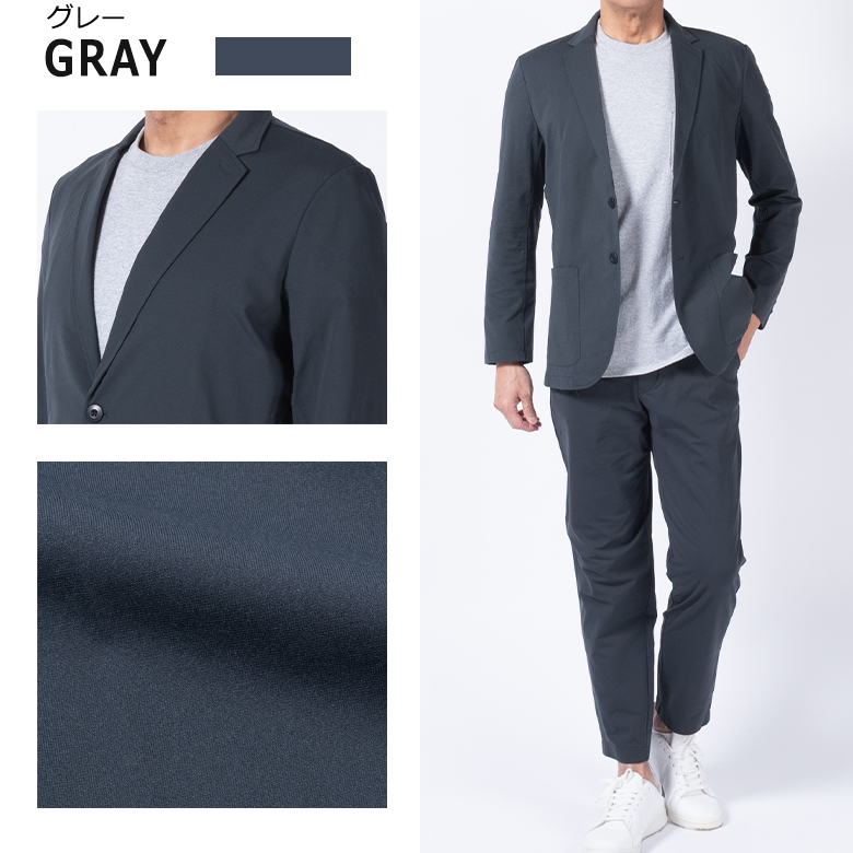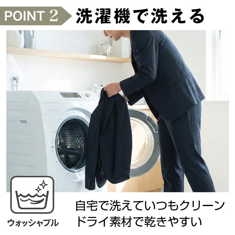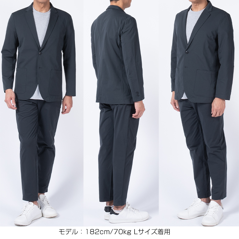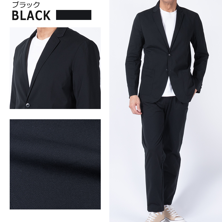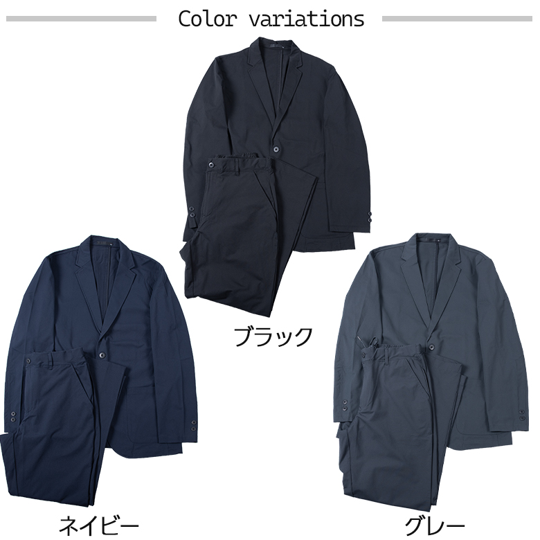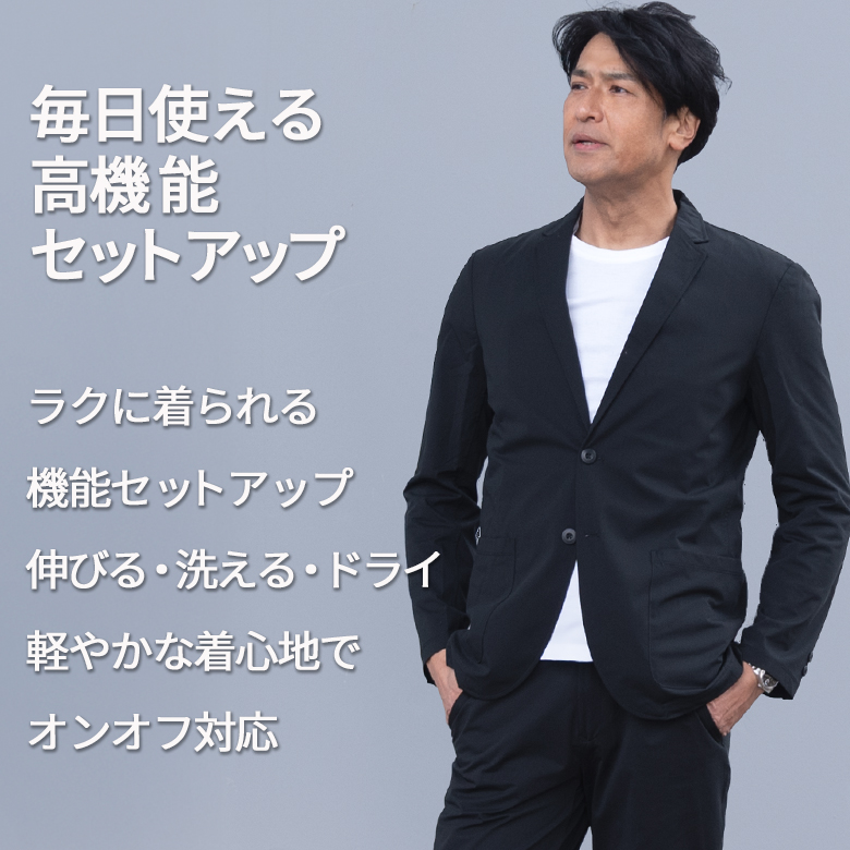 【キーワード】 メンズ セットアップスーツ カジュアルスーツ ビジネスカジュアル ビジカジ 洗える ウォッシャブル 洗濯機で洗える 自宅で洗える ストレッチ 2WAYストレッチ 伸縮素材 軽量 ドライ素材 通気性 オールシーズン 出張 旅行 通勤 ジャケット テーパードパンツ ブラック ネイビー グレー