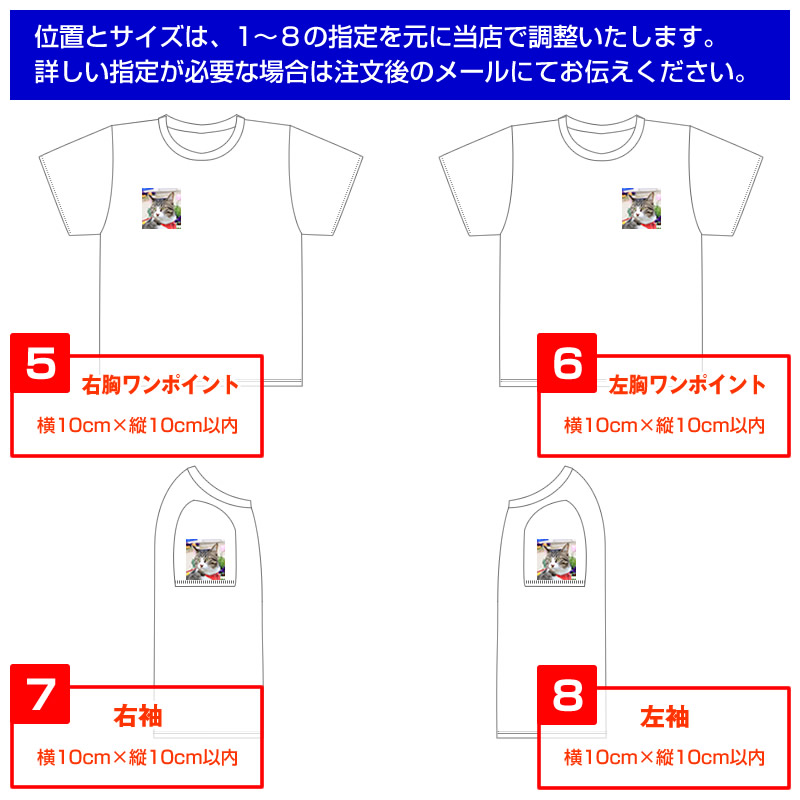 袖・右胸・左胸ワンポイントともに縦横10cmまで