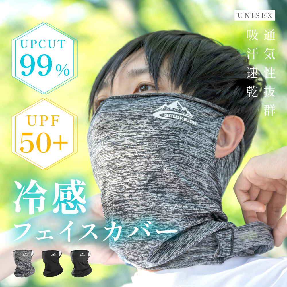 【接触冷感でひんやり涼しい】涼感と通気性に優れた素材のフェイスカバー。高いUVカット率で日焼けや肌トラブルを防ぎます。直接肌に触れる生地にはお肌に優しい柔らかく通気性の良い素材を採用し、汗をかいてもすぐに乾くから長時間の使用でも快適。