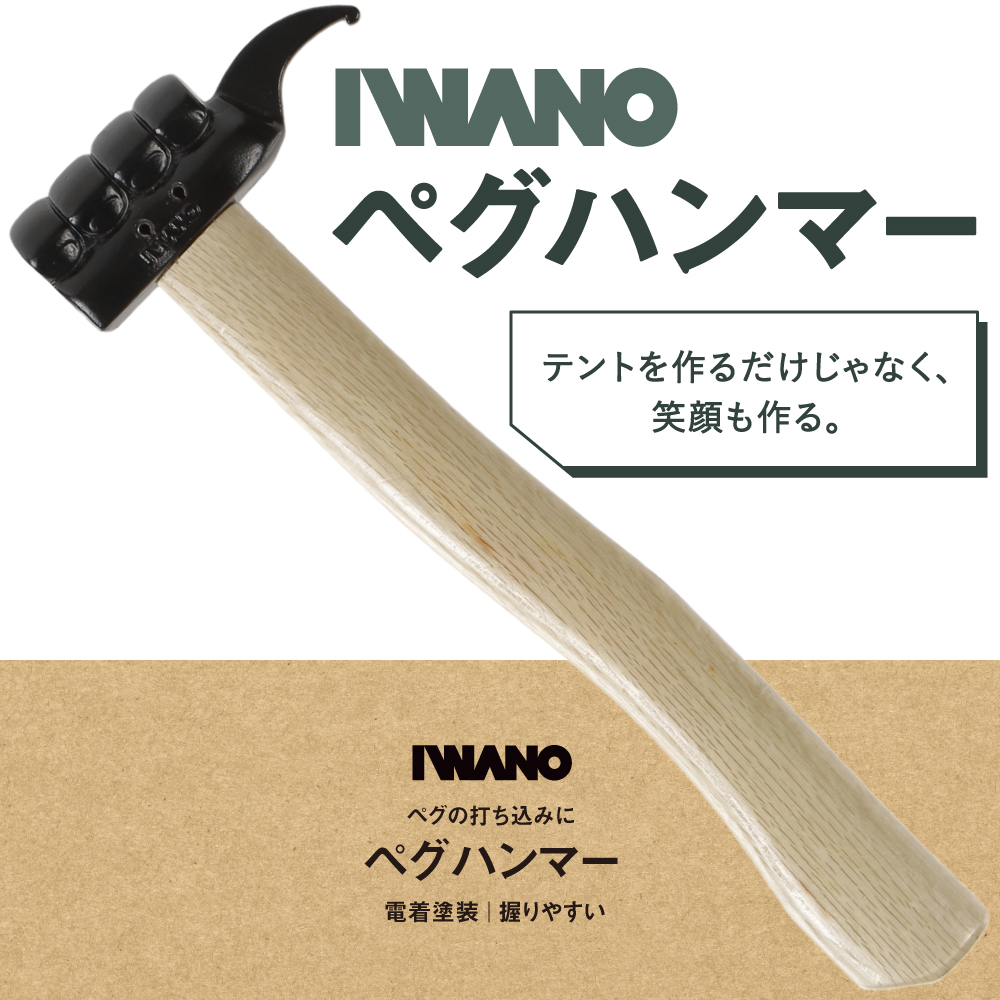 【 IWANO 】 イワノ ペグハンマー 思わず二度見 ヘッド部 電着塗装で耐久性アップ [打ちやすい大きい打面] 握りやすい持ち手 耐久性にすぐれたアカガシ使用 適度な重さで女性や子どもでも打ち込める テント タープ 設営の必需品 ペグ抜き