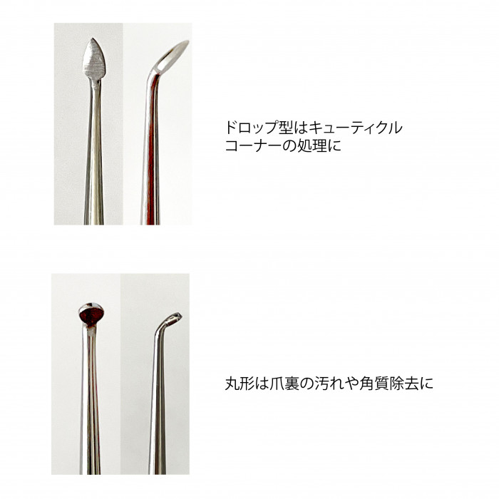 | シリコンカバーの柄が作業する手に優しく疲れにくいキュレットです。ドロップ型はキューティクルコーナーの処理に使えます。丸形は爪裏の汚れや角質除去に便利です。 ※本商品を目的以外に使用しないで下さい。 ※高温や直射日光を避け、お子様の手の届かない場所に保管して下さい。 ※ご使用後は必ず消毒をして下さい。EFビットクリーナーでの除菌をお勧めします。乾燥後付属のキャップをして保管して下さい。 |