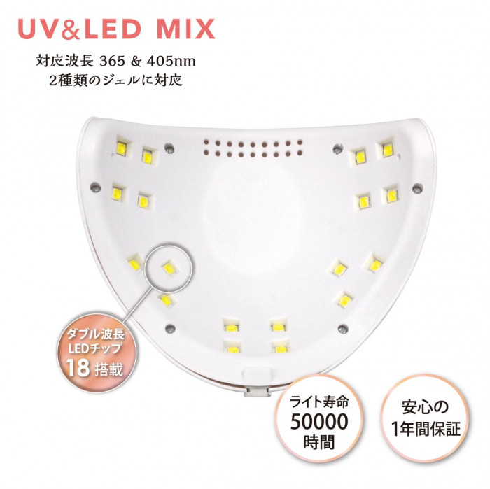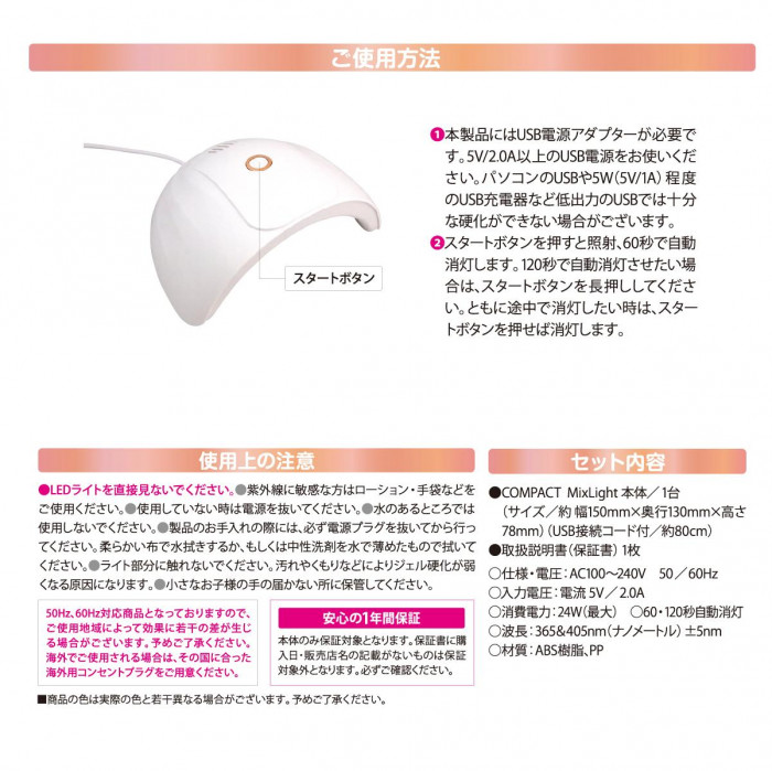 | 仕様 | 保証期間:購入日から1年間 ライト寿命:約50000時間 UV&LEDジェルに対応(対応波長365&405nm) 60・120秒自動消灯 |