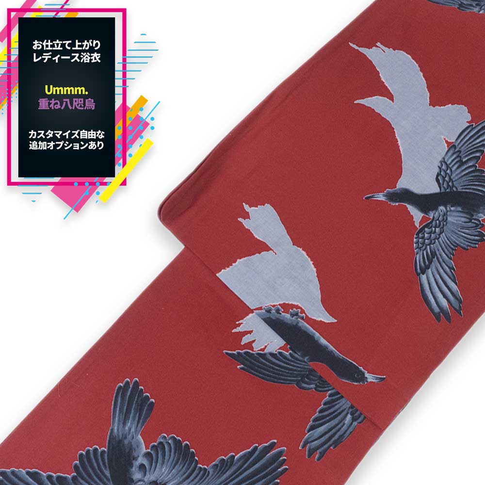 Ummm.重ね八咫烏浴衣 単品 女性用ゆかた【レディース浴衣 単品】 カラス 鳥柄 個性的 夏物 フリーサイズ レッド 赤 深紅
