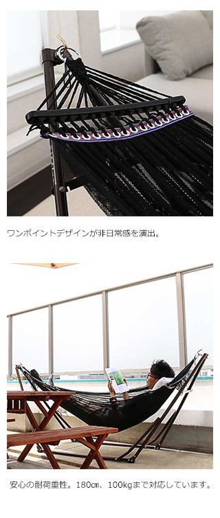 忙しい毎日の中で、「優雅なひととき」を。インテリアにぴったりなカラーリングのハンモック。この1台であなたの生活に「やすらぎ」と「落ち着き」を与えます。室内だけでなくアウトドアでもオシャレさを引き立ててくれます。ハンモック用生地サイズ(約)2270×410mm/エアー枕サイズ(約)430×275mm/耐荷重(約)100kg以下/対象身長(約)180cm前後/収納時サイズ / 重量(約)1150×170×125mm / 8,800g