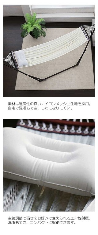 ハンモック:ポリエステル、スタンド:スチール、枕:PVC、収納バッグ:ポリエステル