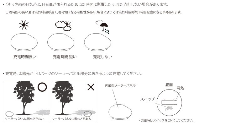 | 裏面には手動のオン・オフ スイッチ付きスイッチをオフにしておくと、暗くなっても自動で点灯しません充電時はスイッチをオンにしてください | ||||||||||||||||||||||