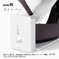| Function 02 ストッパー 靴のズレ落ちや、本体前面への飛び出しを防ぐストッパー機能。片手で取り出しやすい引き出し用穴付き。 | ||||||||||