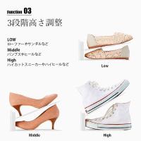 | Function 03 高さ調整 ハイヒールからローファーシューズまで、様々な高さの靴に対応できるよう3段階の調整ができるようになっています。 | ||||||||||