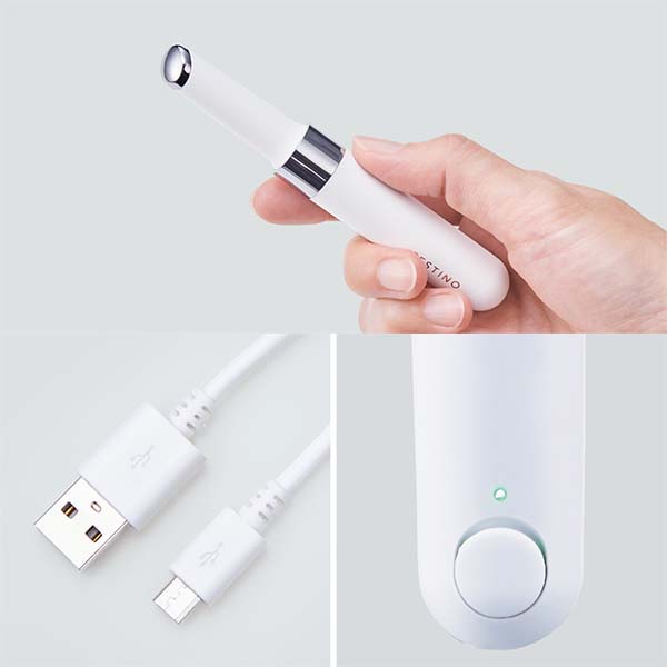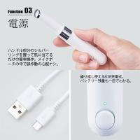 | Function 03 電源 ハンドル部分のシルバーリングを握って肌に当てるだけの簡単操作。メイクポーチの中で誤作動の心配ナシ。繰り返し使えるUSB充電式。バッテリー残量も一目でわかる | |||||||||||||||||