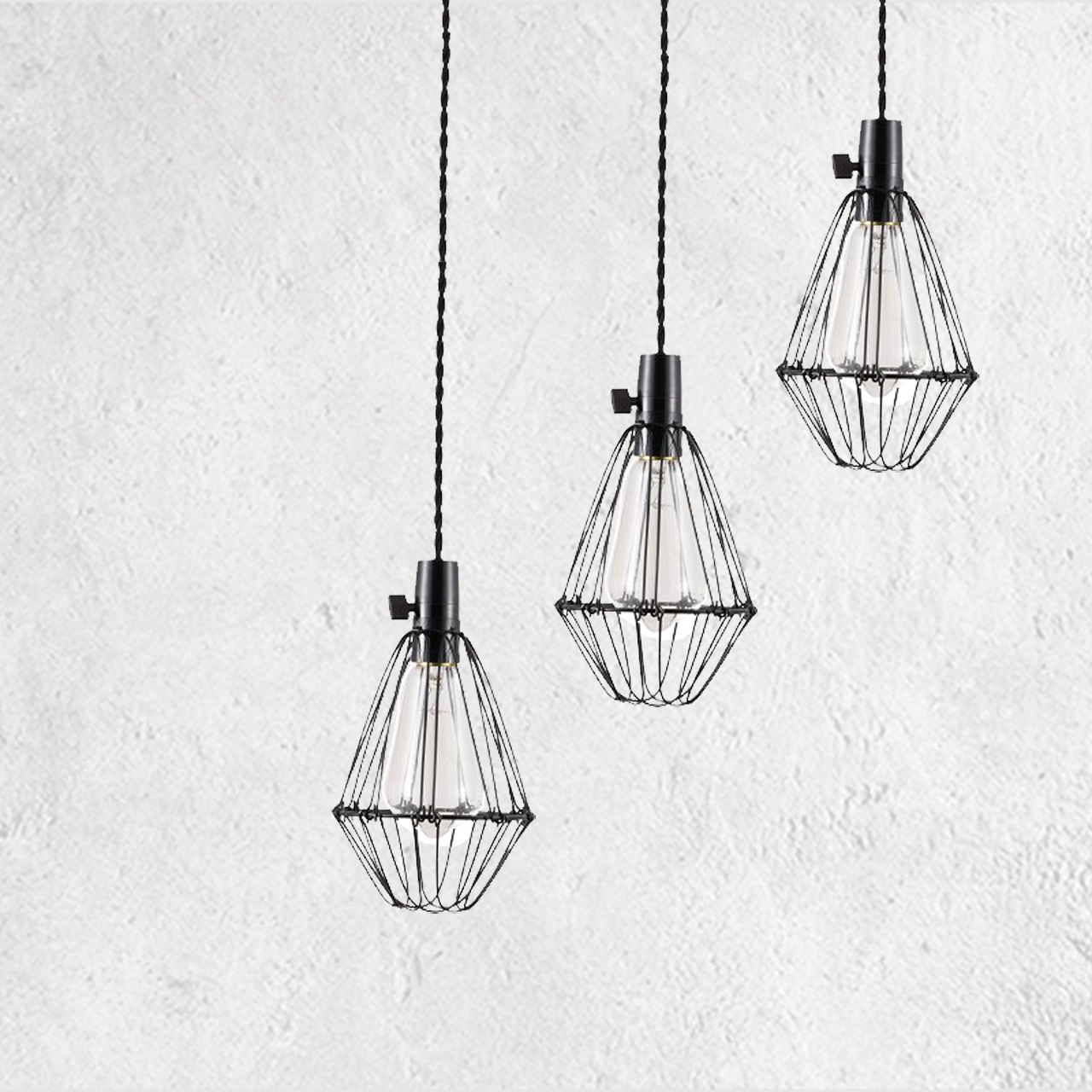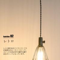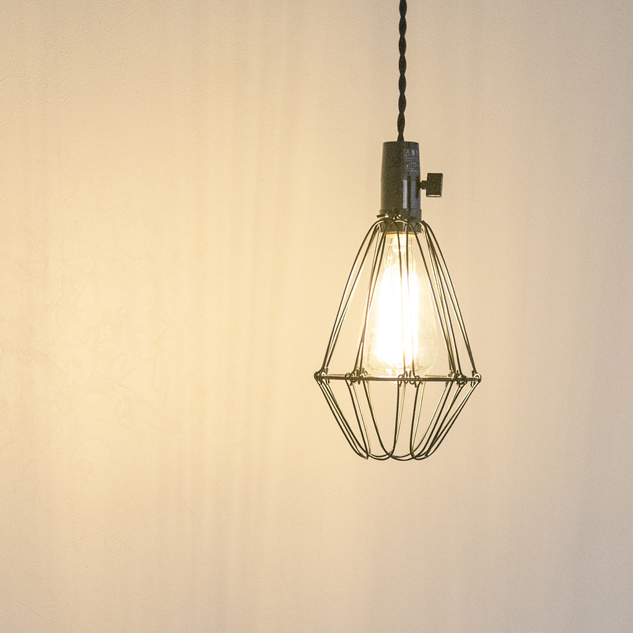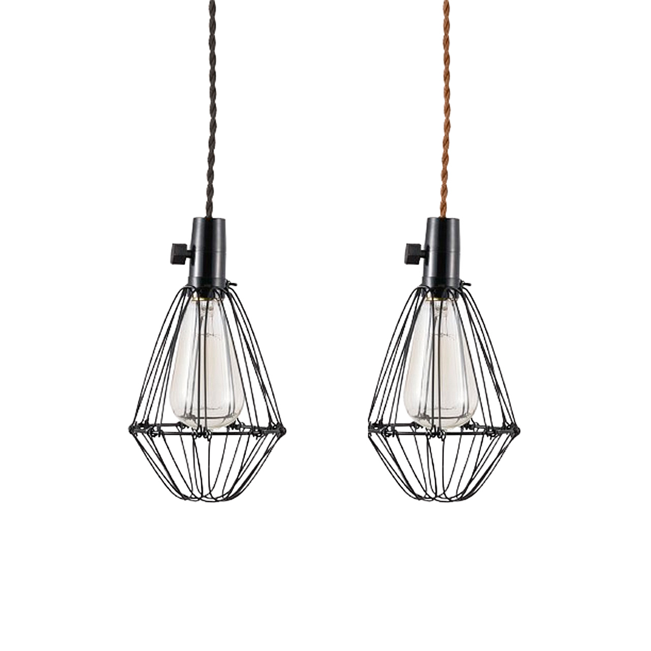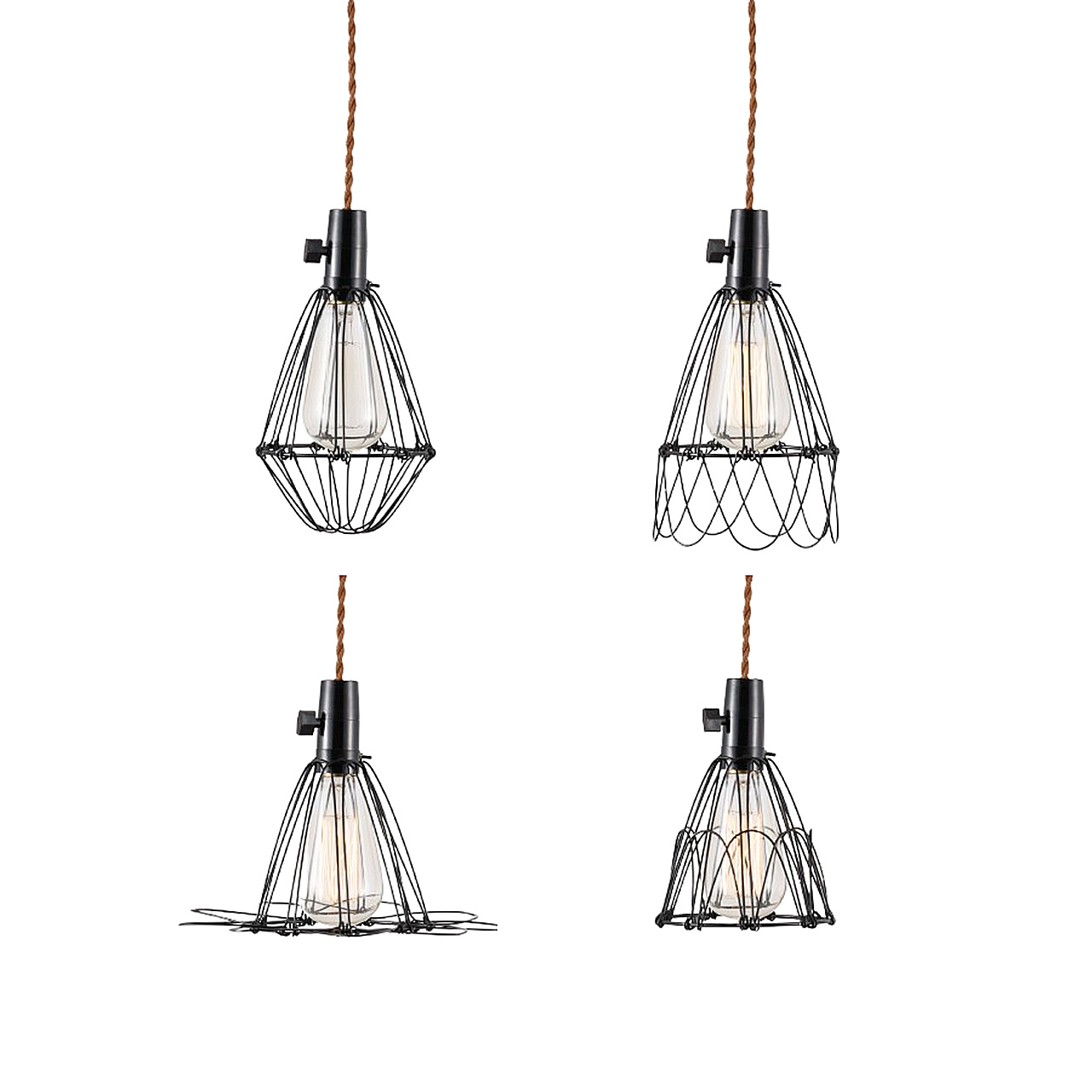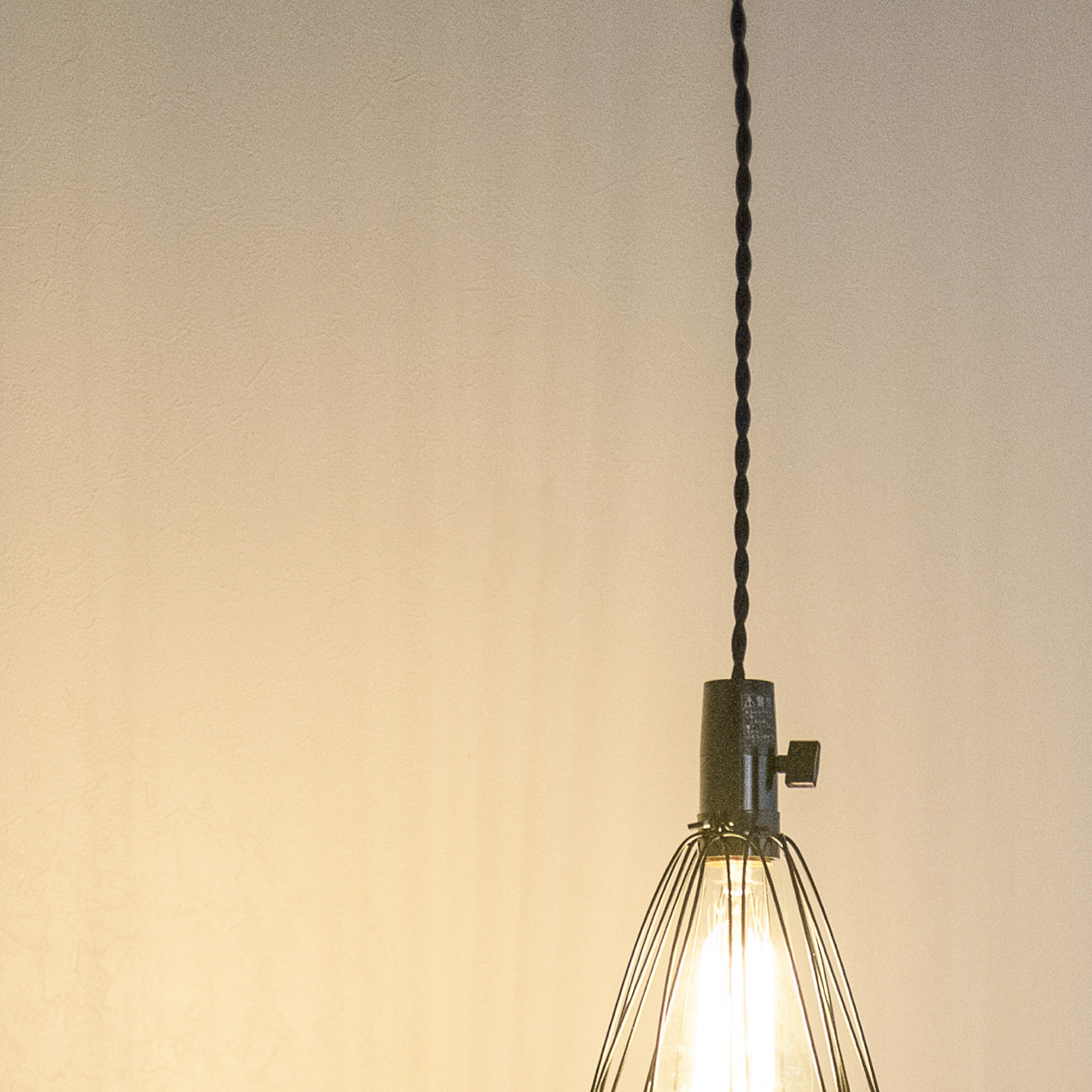 | PENDANT LIGHT SWITCH WIRE BLACK スイッチワイヤーブラック (電球別売モデル) レトロでガレージライクな趣きある1灯ペンダント レトロ感のあるツイストコードと灯具部分のロータリースイッチ。シェードはガレージ感のあるスチールワイヤーを組み合わせて趣きある雰囲気に仕上げた1灯タイプのペンダントライト。ワイヤー下部が開く設計になっており、電球の交換だけでなく、形状を変えることで雰囲気の異なる見た目にすることも可能です。多灯吊りで連続使用するのも良し、狭小スペースで単灯使用も雰囲気抜群。シェードはブラックですが、コードがブラック、もしくはブラウンの2色からお選びいただけます。 | ||||||||||||||||||