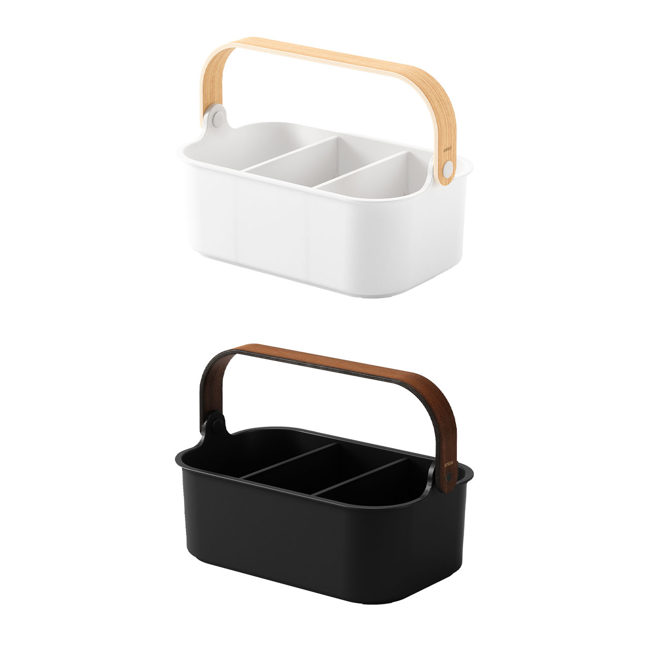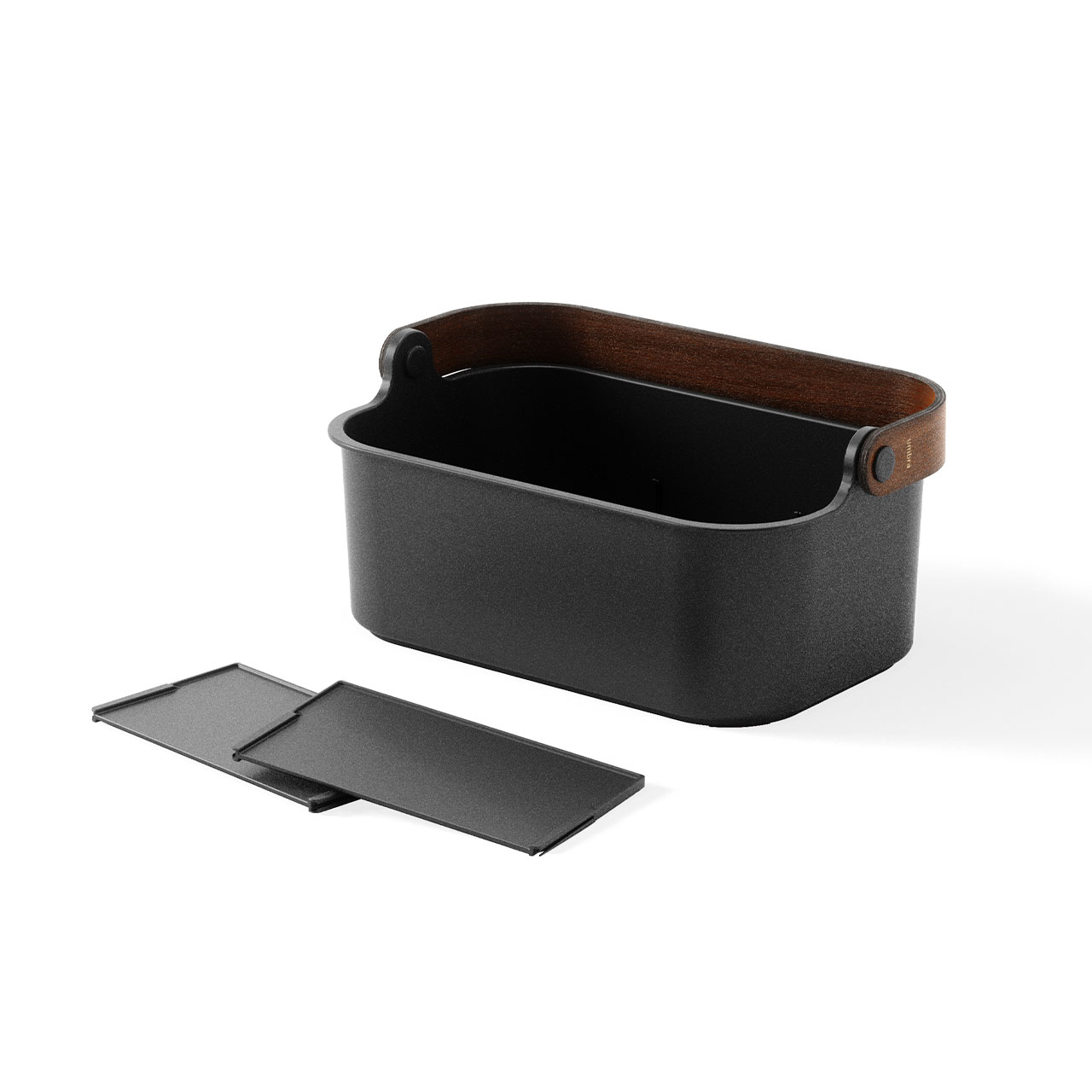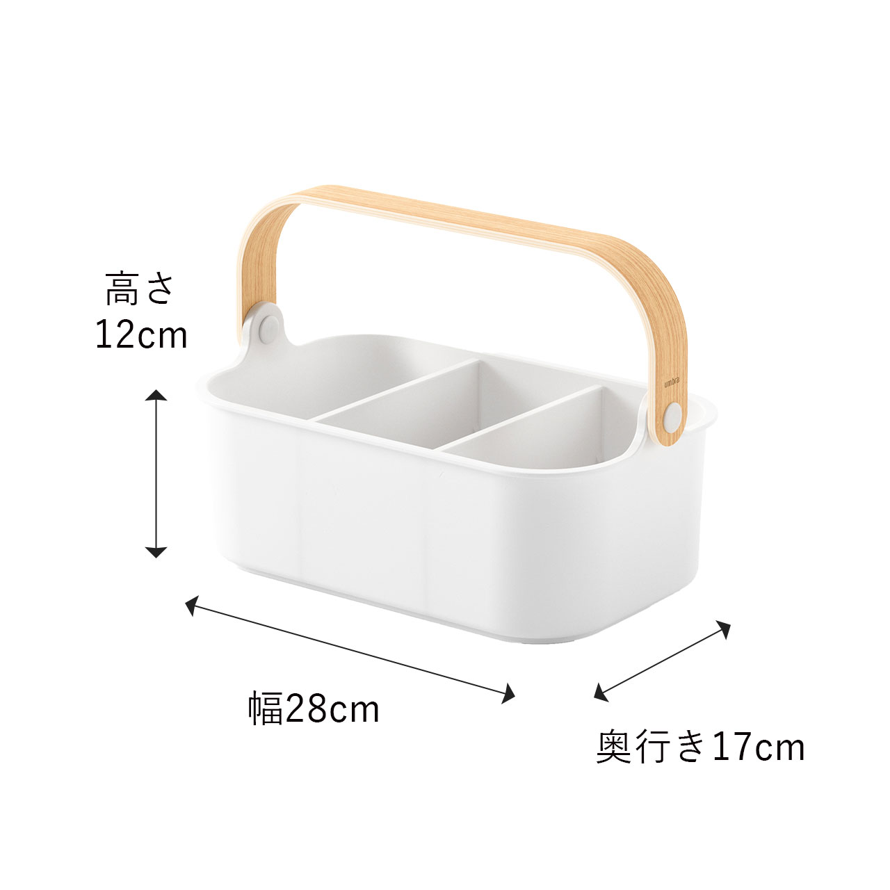 | 形状 取り外し可能な仕切りと、持ち運びに便利な木製ハンドル付き。ハンドルを倒せばスタッキング可能。 | |||||||