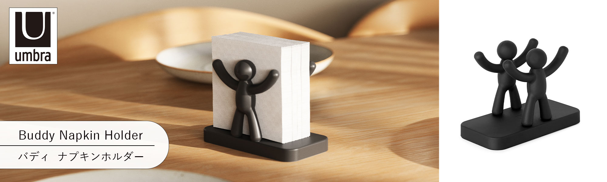 | 形状 バディが両側からナプキンを支える、Umbraらしいユーモアと機能美を兼ね備えたナプキンホルダー。スリムなデザインで省スペースに収納可能。 | |||||||