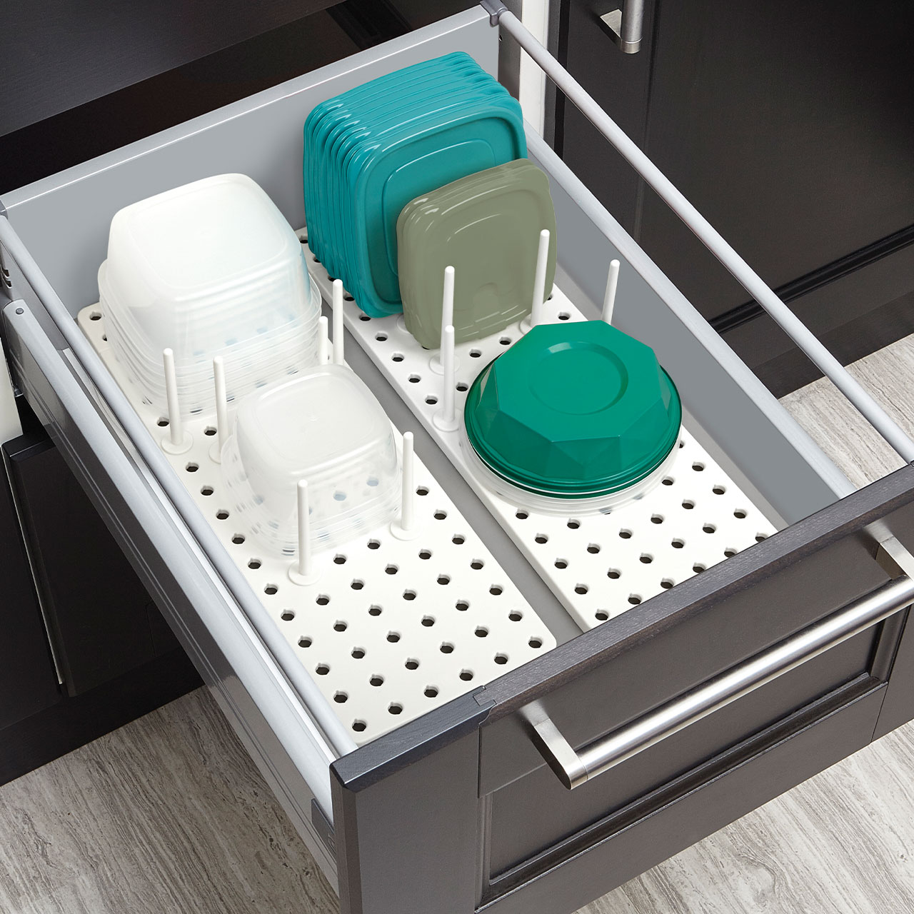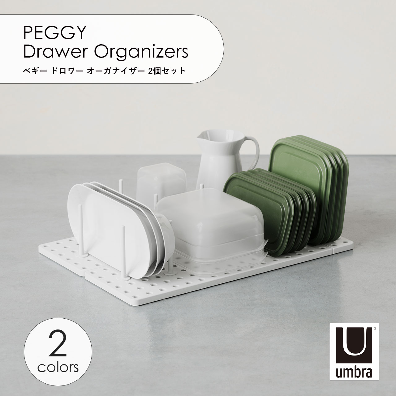 | ペギー ドロワー オーガナイザー 2個セット PEGGY Drawer Organizers 引き出し収納用オーガナイザー 付属のペグ(仕切り棒)をお好みの位置に配置し、スマートに調理器具や食器を収納することができます。ペグは収納した物が倒れるのを防ぎ、しっかりと支えてくれます。横幅は引き出しに合わせて伸縮可能。 | |||||||||||