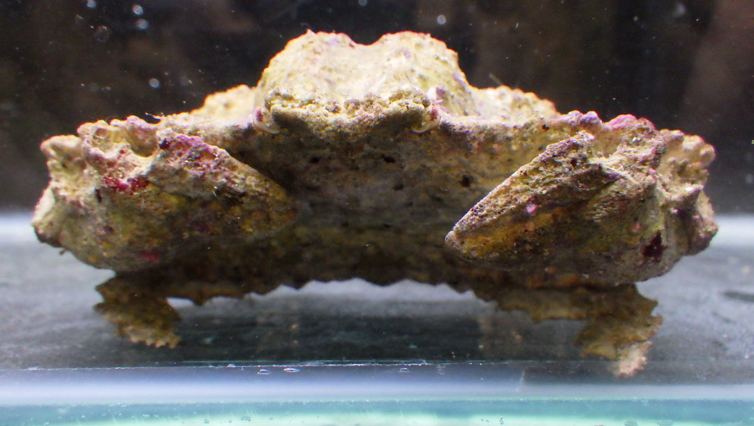 | 生態・特徴 | 本種はインド・太平洋域の水深35〜200mの範囲で確認されていますが、大抵は水深40mまでの岩礁域に生息しているようです。面子(メンコ)の名前通りに平らな背甲を持っており、ほとんど動かないため、非常に巧妙な擬態を行います。 |