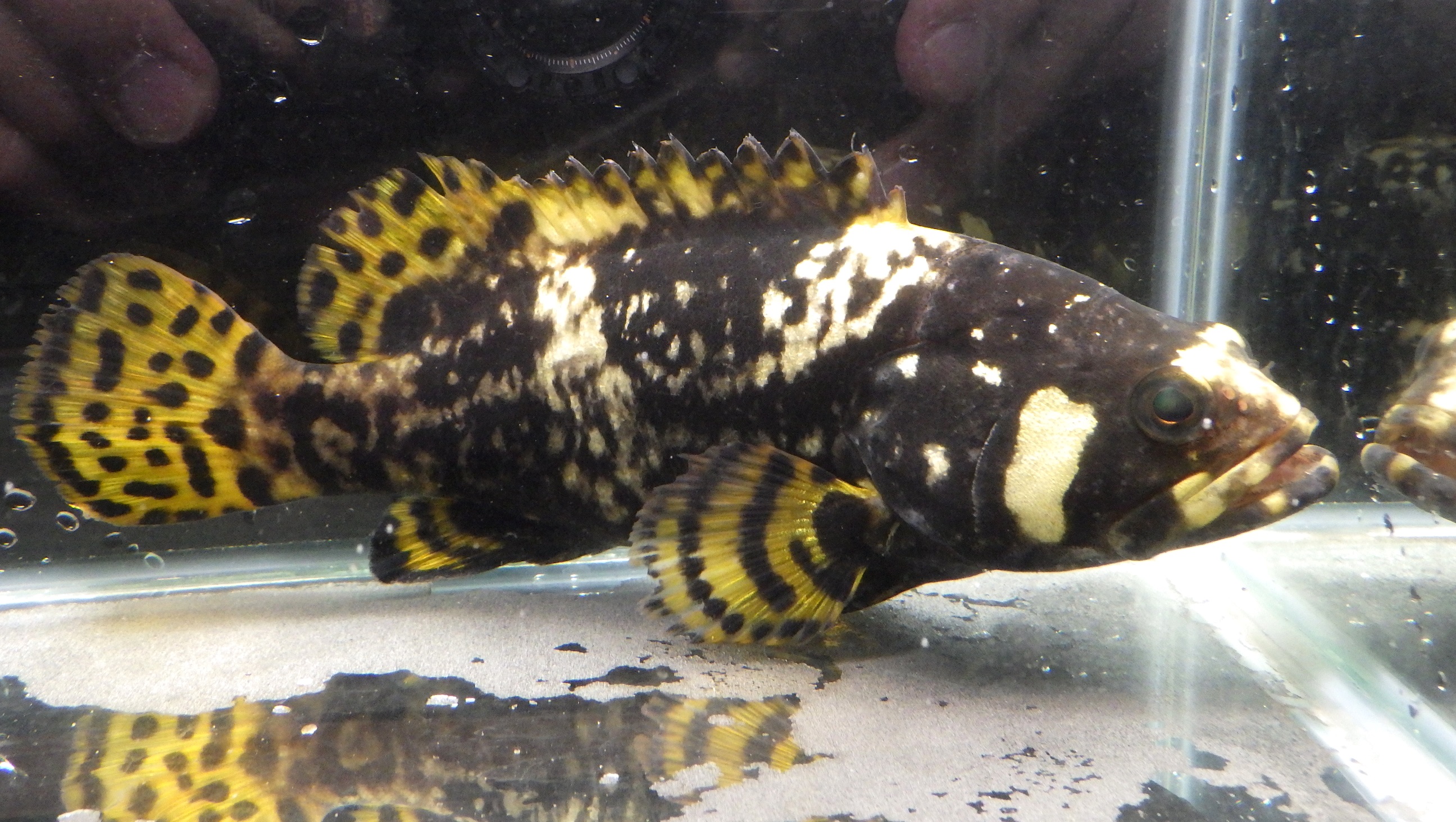| 生態・特徴 | 水深50m以深のサンゴ礁域、岩場、洞窟に生息しており、沈没船を住処とする場合もあります。日本では琉球列島などで確認されており、高級食材としても知られています。ハタ科最大種で、英名の"ジャイアントグルーパー"の名でも流通しています。幼魚は黄色と黒色の斑紋が不規則に入っていますが、成長に伴い体色が灰褐色〜灰緑色になり、明色の斑模様へと変化します。また、鰭に黒色の小さな斑紋が多数ありますが、成魚〜老魚になるにつれて各模様は不明瞭になっていきます。甲殻類、魚類だけでなく、ウミガメの幼体を捕食する事もあります。 |