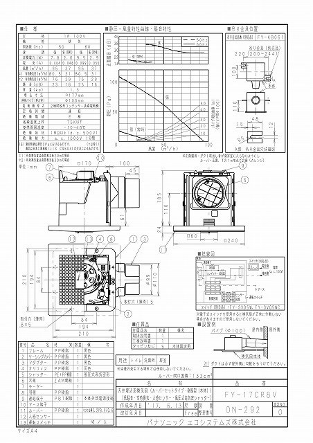 | 特長 | トイレから24時間低風量換気を行いながら人の入室をセンサーが感知して 急速運転、退室後最大15分の残遅運転でニオイなどを排出したのち常時換気運 転に戻ります ●高効率モーターで低消費電力 ●低騒音設計 ●羽根が簡単に外せてお掃除ラクラク ●常時換気機能で、24時間小風量換気運転が可能 ●人感センサー付 ●風圧式高気密シャッター ●電源接続部−本体外部 本体:樹脂製 羽根:樹脂製 ルーバー:樹脂製 埋込寸法:177mm角 適用パイプ:呼び径φ100mm ■スイッチ(別売品) FY-SV05W(ON-OFF)壁埋込形 FY-SV05WC(ON-OFF)壁埋込形・カバー付 |