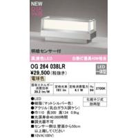 高演色LED 白熱灯器具40W相当 OG264038LR 電球色 2700K 消費電力4.1W Ra94 ●LED ●脂(マットシルバー色)●アクリル(乳白ガラス調ケシ) ●巾110 長300 高134 0.9kg ■光源寿命40,000時間 ■調光器不可 ■センサー側は,壁面から50cm以上離してください 化粧ネジ式 防雨型 その他