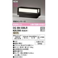 高演色LED 白熱灯器具40W相当 OG264039LR 電球色 2700K 消費電力4.1W Ra94 ●LED ●脂(黒色)●アクリル(乳白ガラス調ケシ) ●巾110 長300 高134 0.9kg ■光源寿命40,000時間 ■調光器不可 ■センサー側は,壁面から50cm以上離してください 化粧ネジ式 防雨型 その他